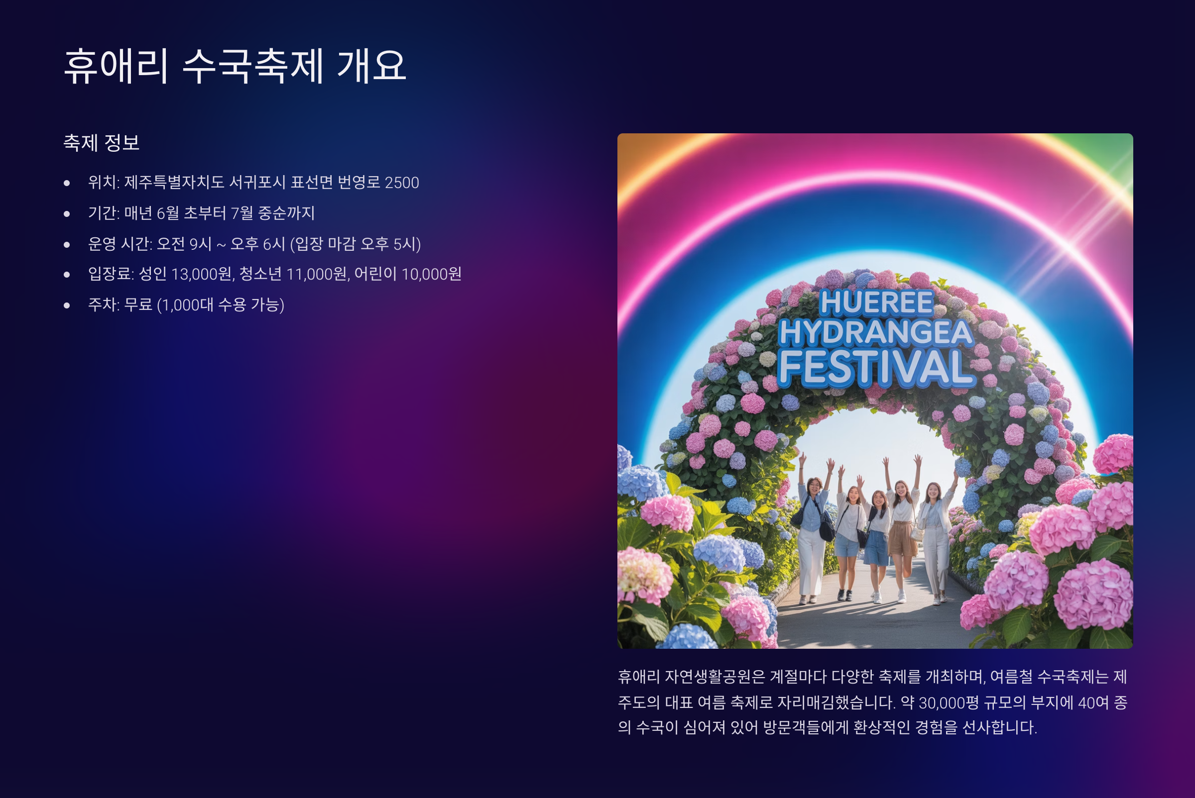| 6월 1일 ~ 7월 15일 | 제주 휴애리 자연생활공원 | 수국 꽃밭 관람, 체험, 공연 |
