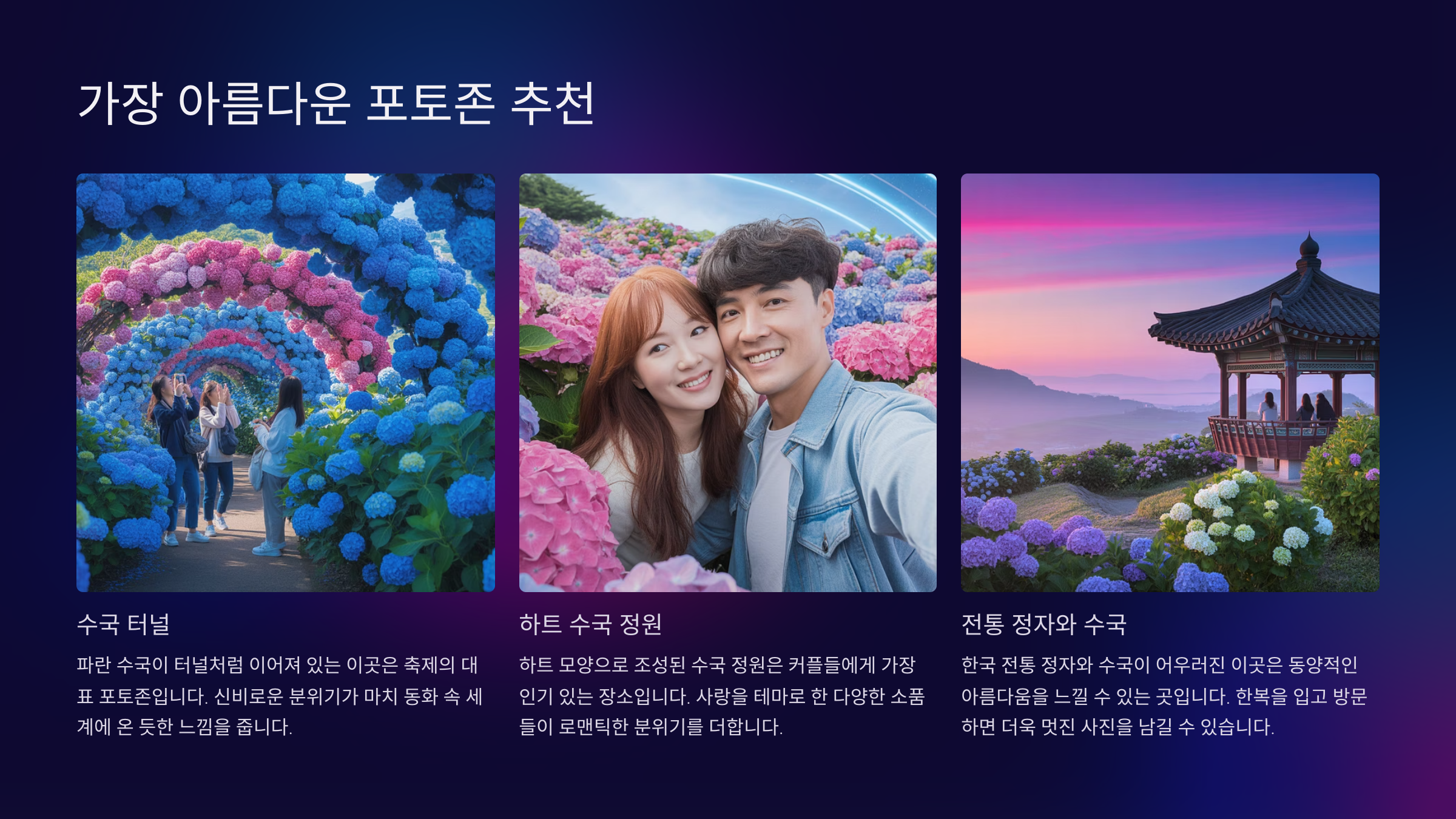 - 수국 터널: 꽃에 둘러싸인 몽환적인 사진을 연출해보세요.