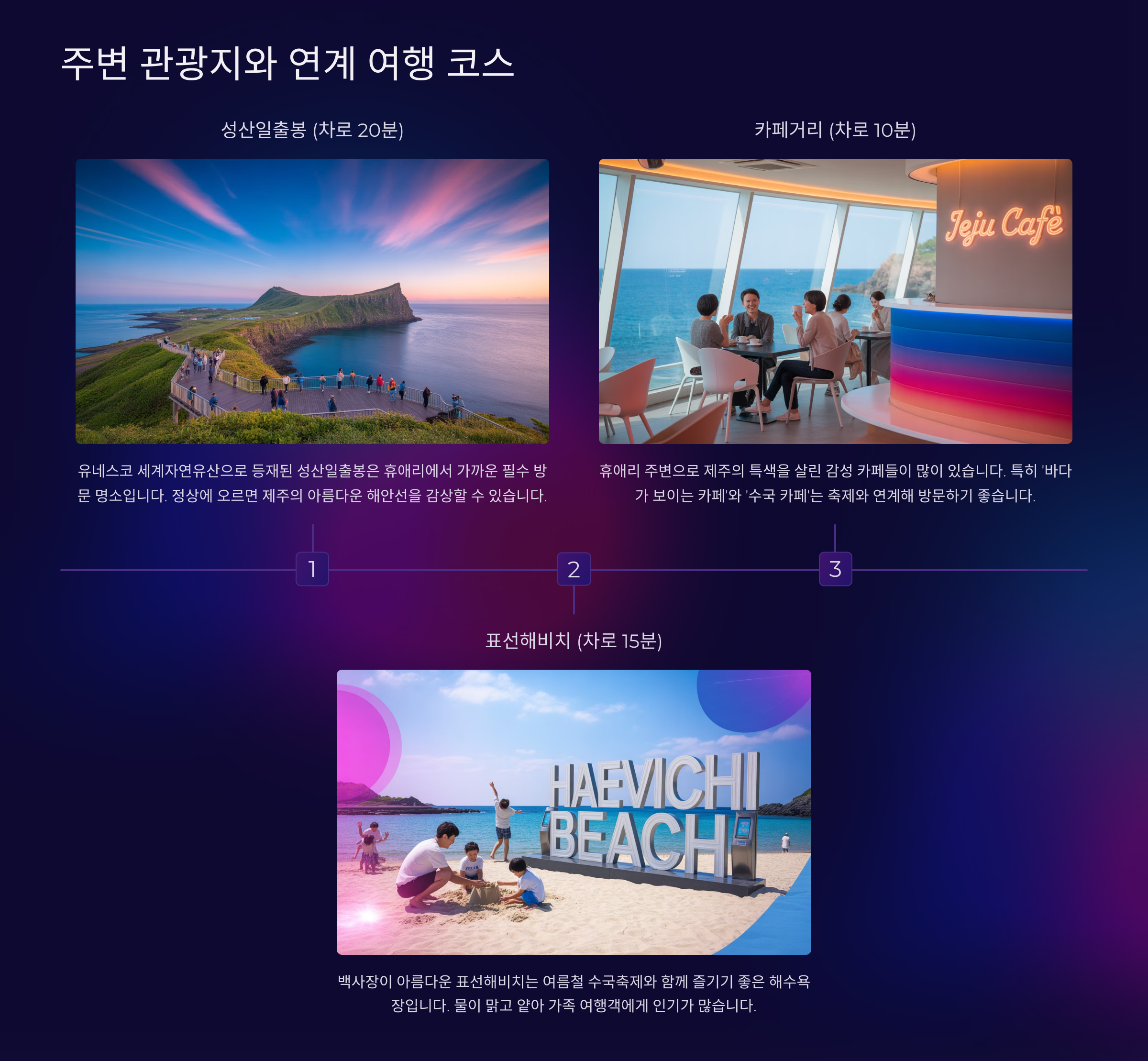 휴애리 방문 전후로 함께 둘러보면 좋은 제주의 매력적인 명소들입니다. 각 장소를 클릭하여 간단한 정보와 휴애리에서의 예상 소요 시간을 확인해보세요.