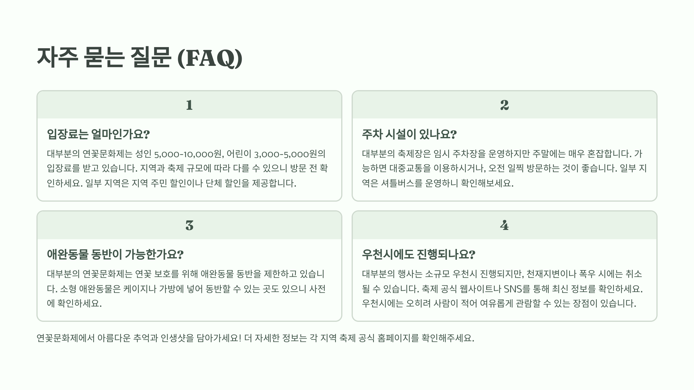 A1. 대부분 지역의 연꽃문화제는 무료 입장이에요. 일부 특별 행사나 체험 부스는 소액의 참가비가 있을 수 있어요.