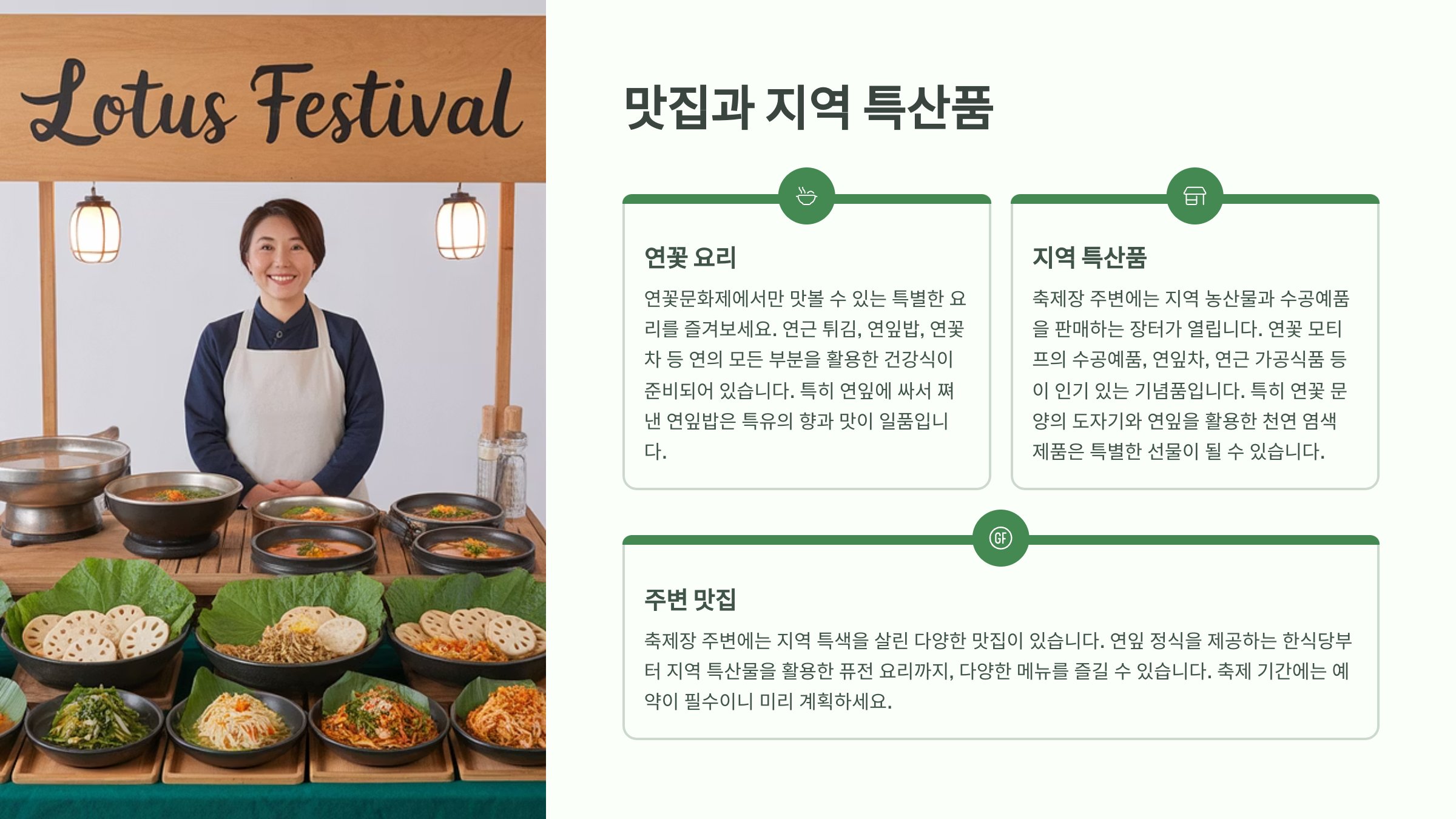 맛있는 음식과 함께 지역 문화를 경험하는 것도 연꽃문화제의 큰 즐거움이에요. 꼭 한 번 들러 보세요! 🍽️