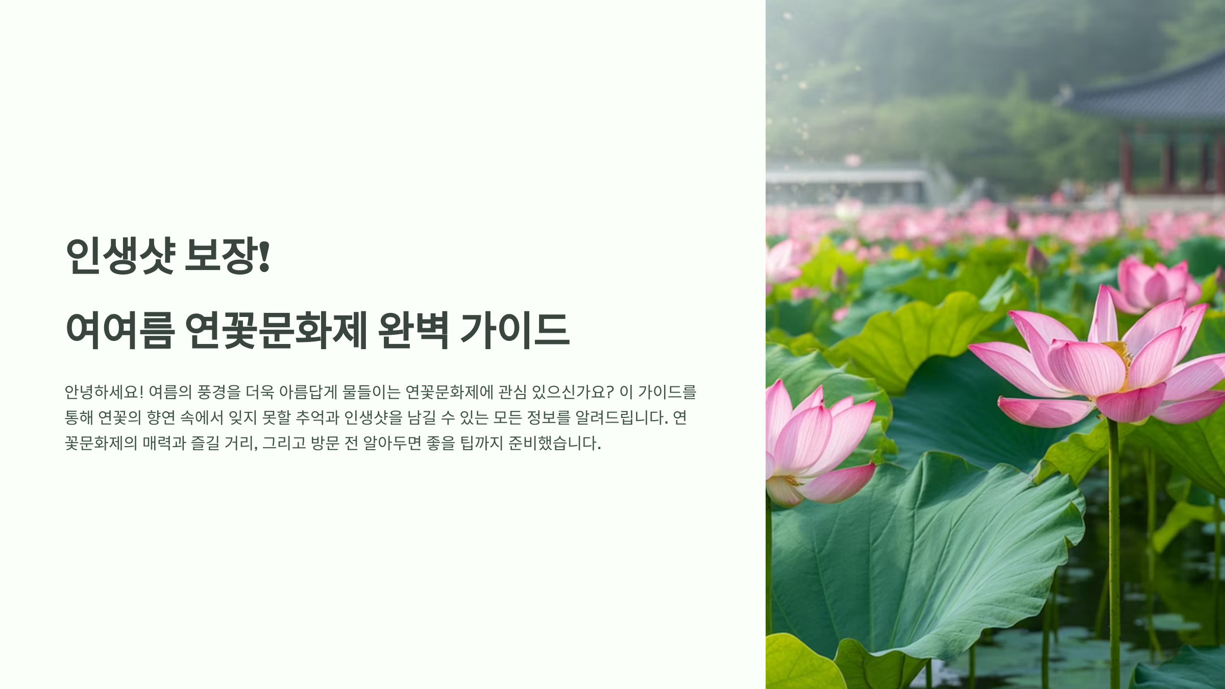 연꽃문화제를 처음 접하는 분부터 매년 찾는 단골까지 모두 만족할 수 있도록 풍부한 정보로 가득 채웠답니다. 지금부터 본격적으로 연꽃문화제의 모든 것을 파헤쳐볼게요! 🌸