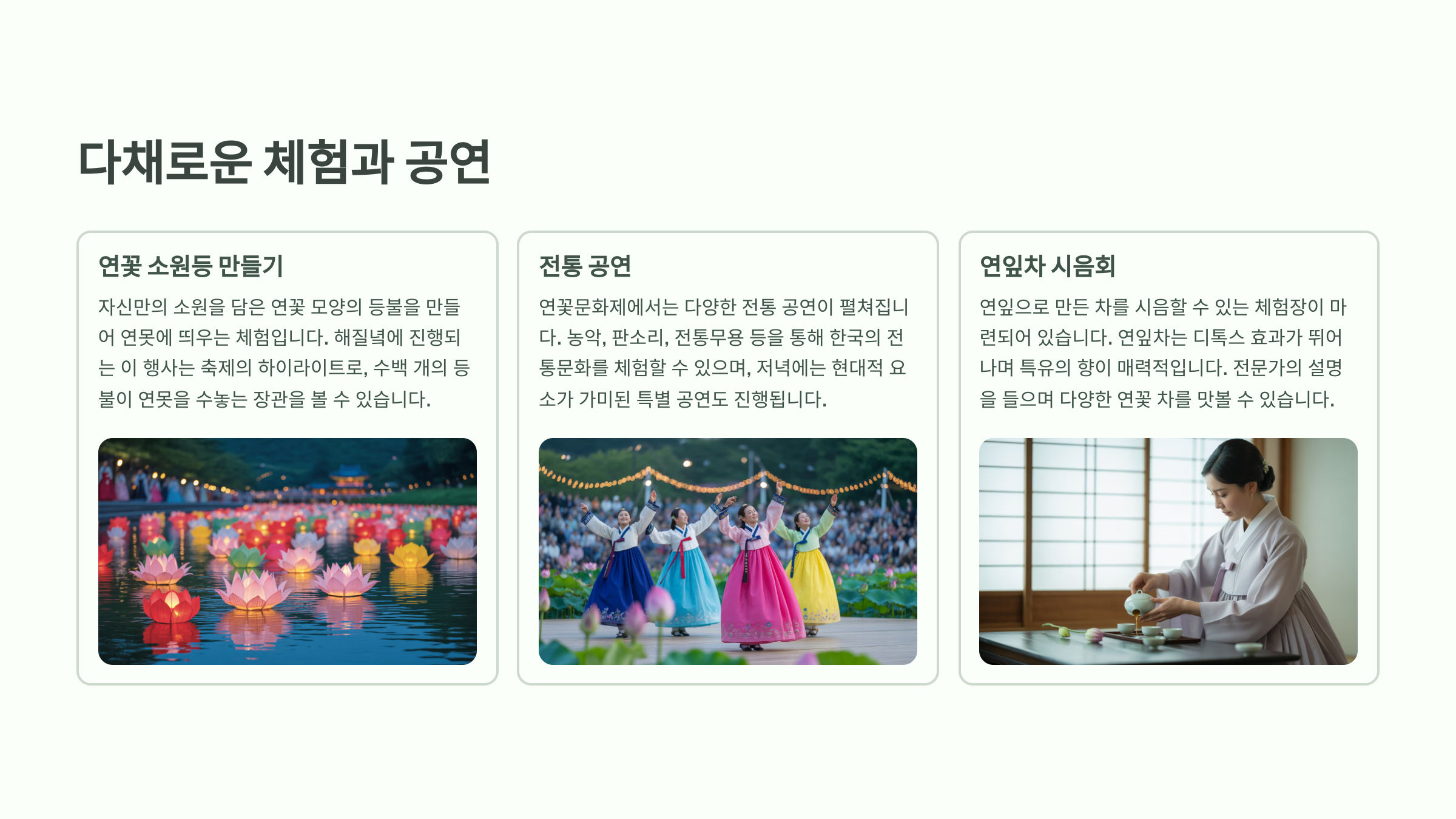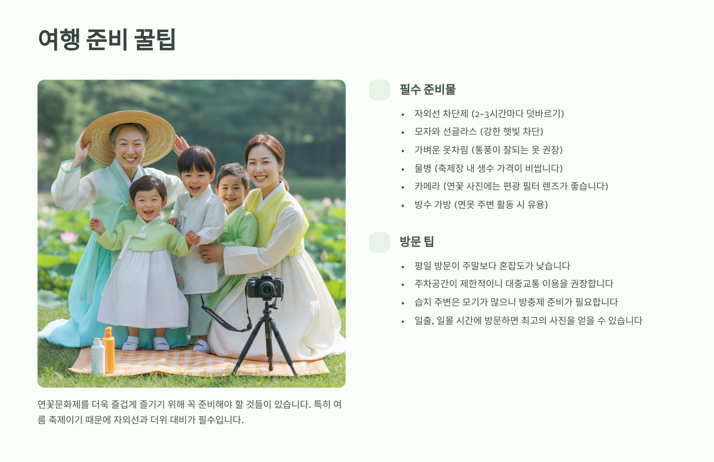 이처럼 연꽃문화제는 풍부한 프로그램으로 누구나 만족할 수 있어요. 방문 전 미리 원하는 체험을 골라 보는 것도 재미있답니다! 🎨