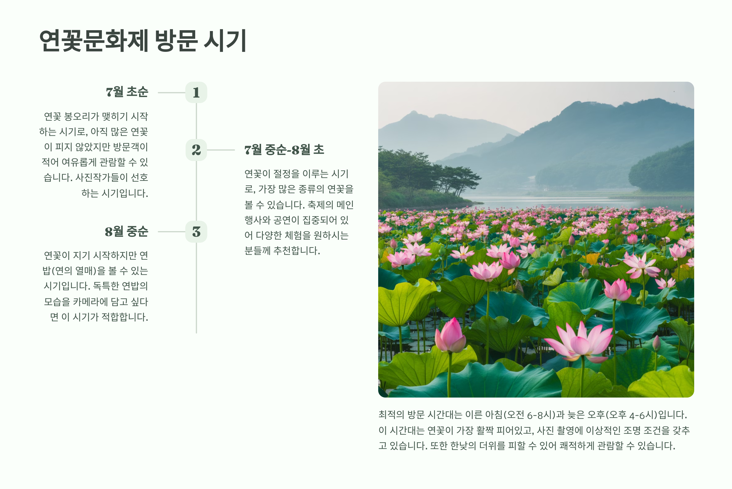 적절한 방문 시기를 선택하면 더욱 풍성한 연꽃문화제를 경험할 수 있어요. 여름 여행 계획에 꼭 참고해 보세요! 🌞