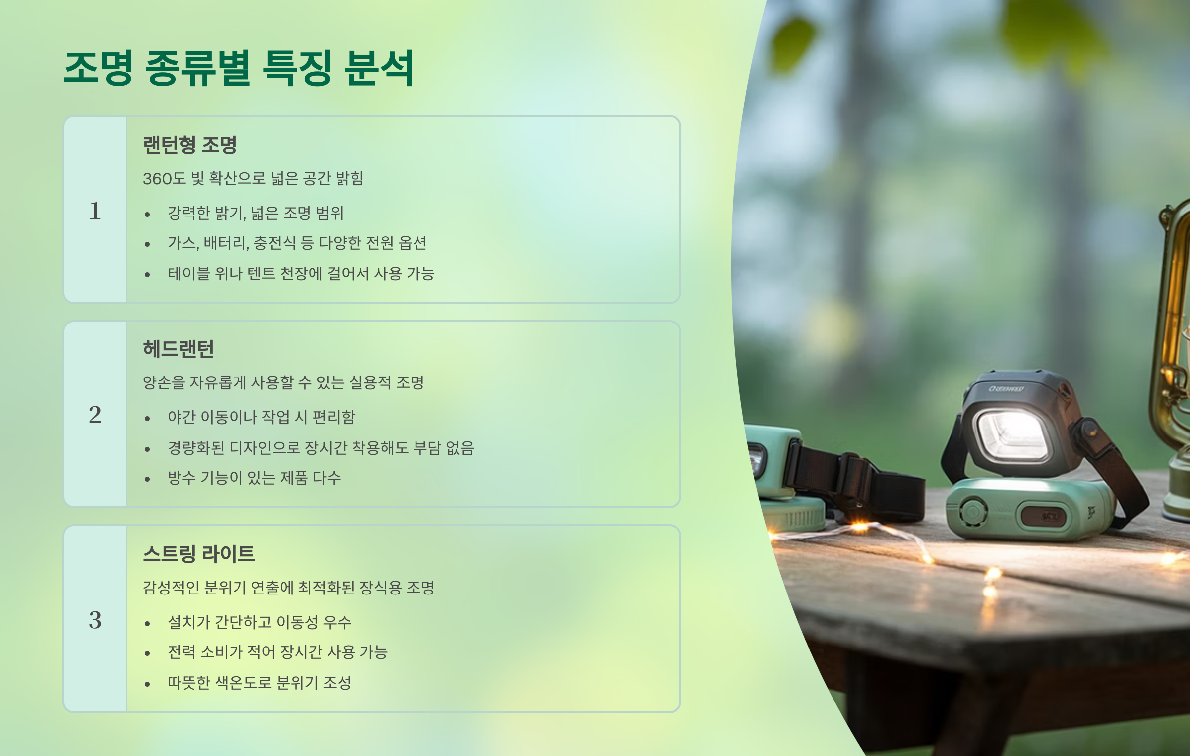 각 조명은 목적과 상황에 따라 선택할 수 있어요. 랜턴은 넓은 공간을 밝히고 안정적이지만, 헤드램프는 손을 자유롭게 해줘서 작업할 때 편리하답니다. 분위기 연출에는 스트링 라이트와 촛불 램프가 정말 잘 어울려요!