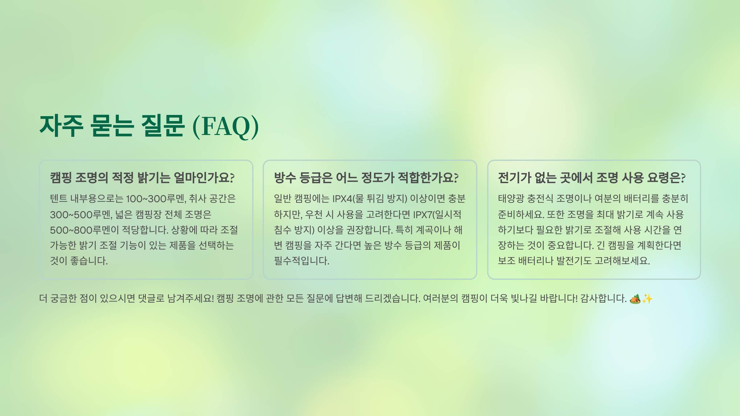 조명과 배터리 성능을 꼼꼼히 따져서 구매하면 더욱 만족스러운 캠핑 라이프가 될 거예요. 이어서 캠핑 조명 활용 꿀팁도 알려드릴게요!