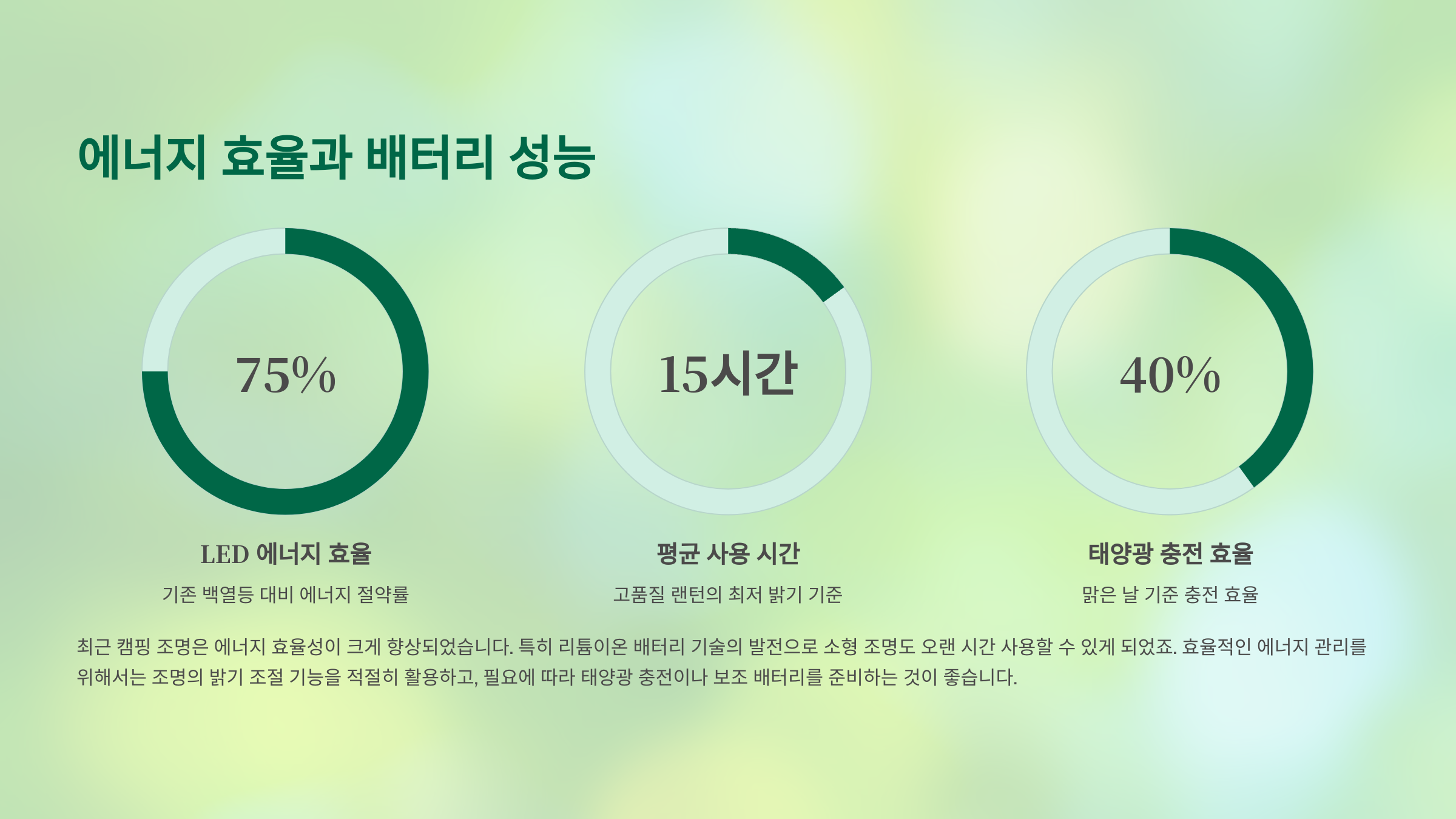 캠핑 조명을 오래 사용할 수 있는지, 배터리 성능이 얼마나 좋은지가 사용 만족도를 크게 좌우해요. 요즘은 LED 조명이 대부분이라 에너지 효율이 뛰어나고, 낮은 전력으로도 강한 빛을 낼 수 있어서 캠핑에 최적화되어 있어요.