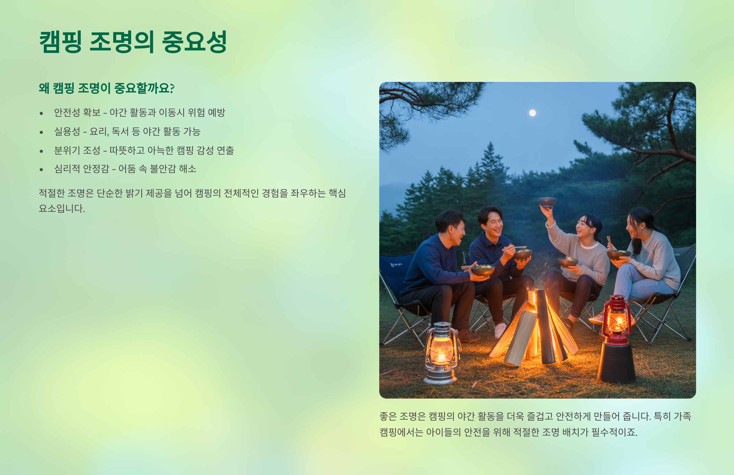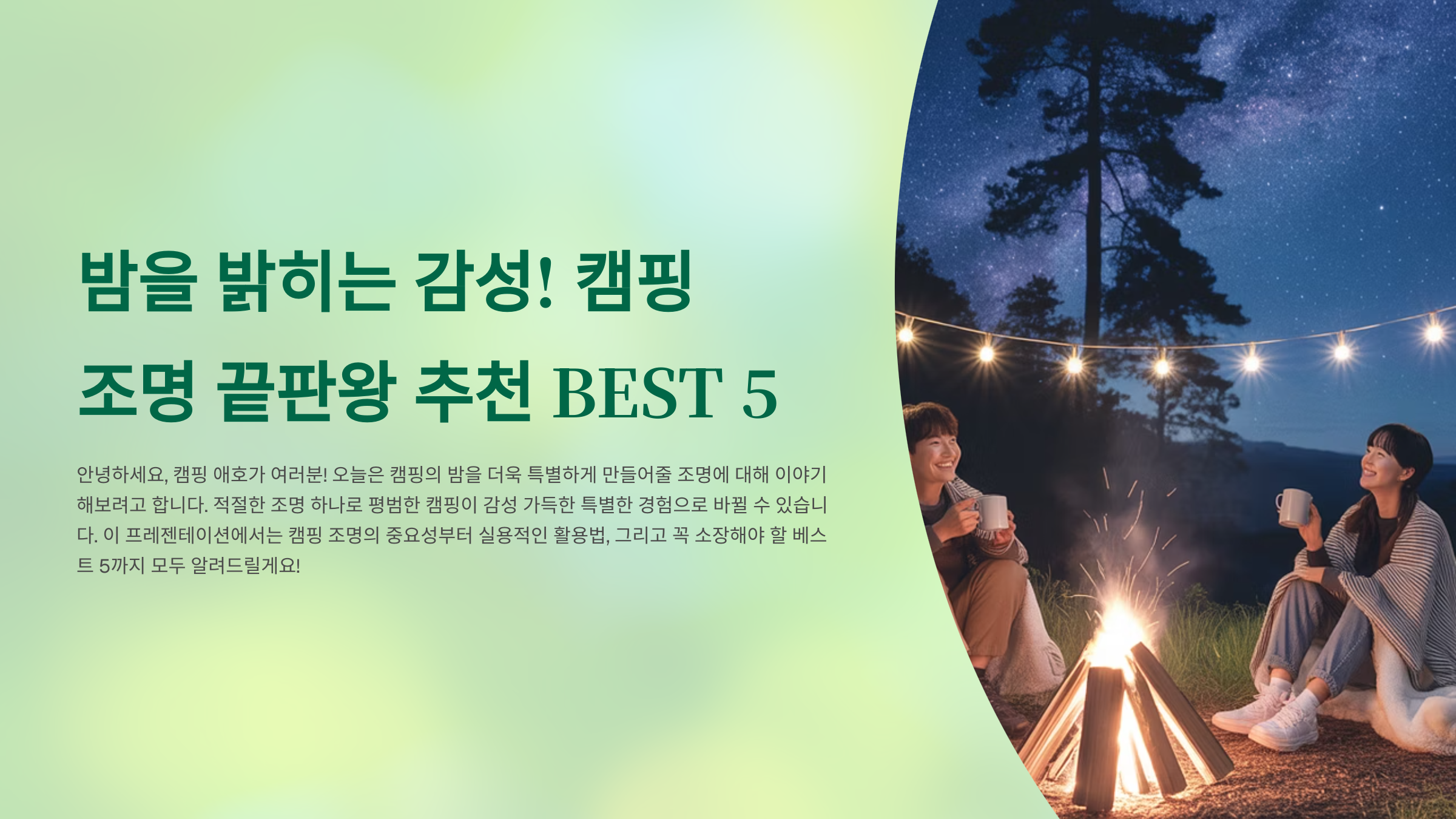 목차와 인트로 확인하셨다면, 다음 답변부터 본격적인 캠핑 조명의 매력과 추천 제품을 심도 있게 나눠볼게요. 기대해주세요! ✨