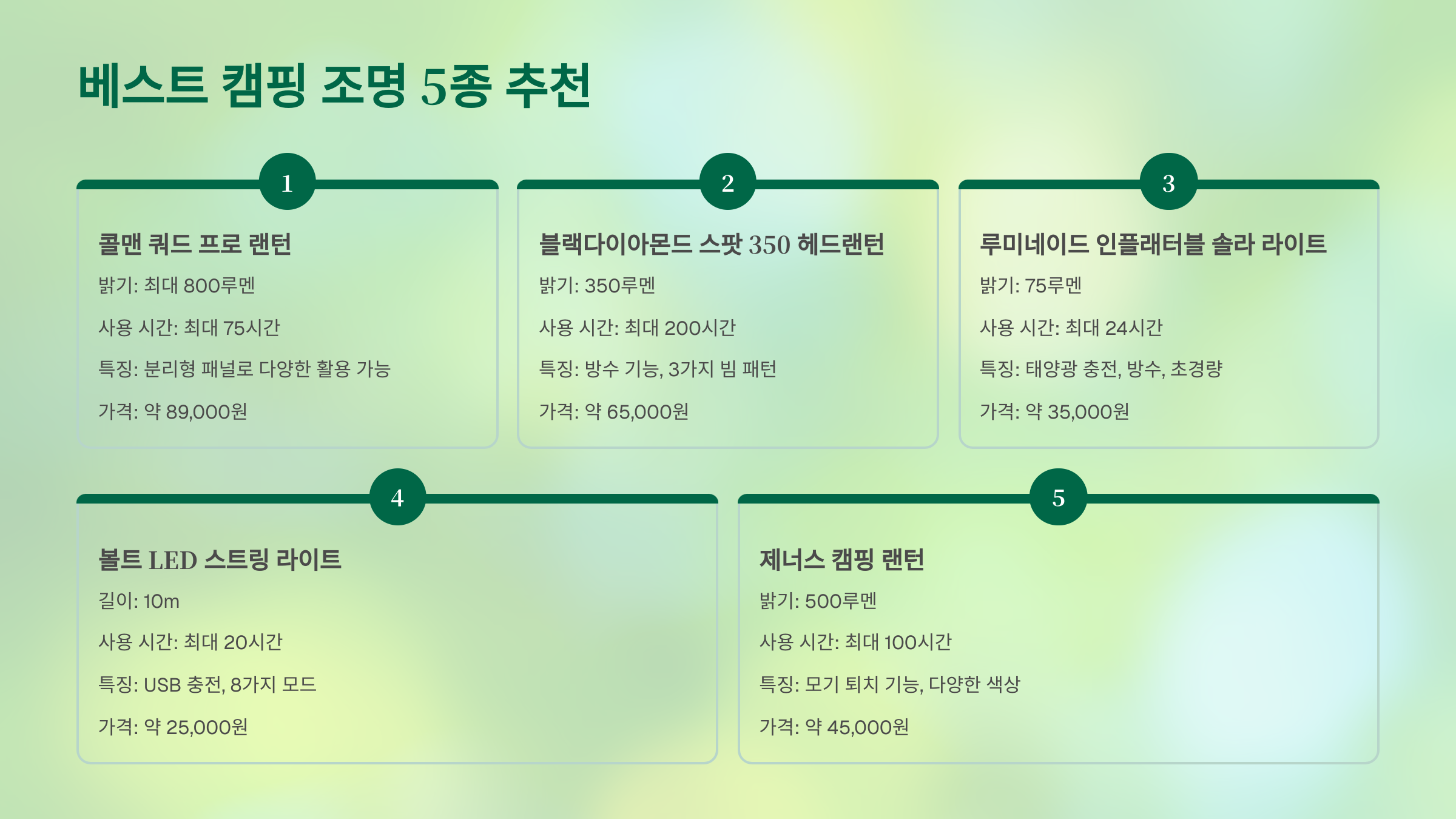 다양한 캠핑 환경과 취향을 고려해 이 5종을 추천해요. 캠핑 분위기를 한층 끌어올리고, 편리함까지 챙기고 싶다면 꼭 참고해 보세요. 이 글이 캠핑 조명 선택에 큰 도움이 되었으면 해요!
