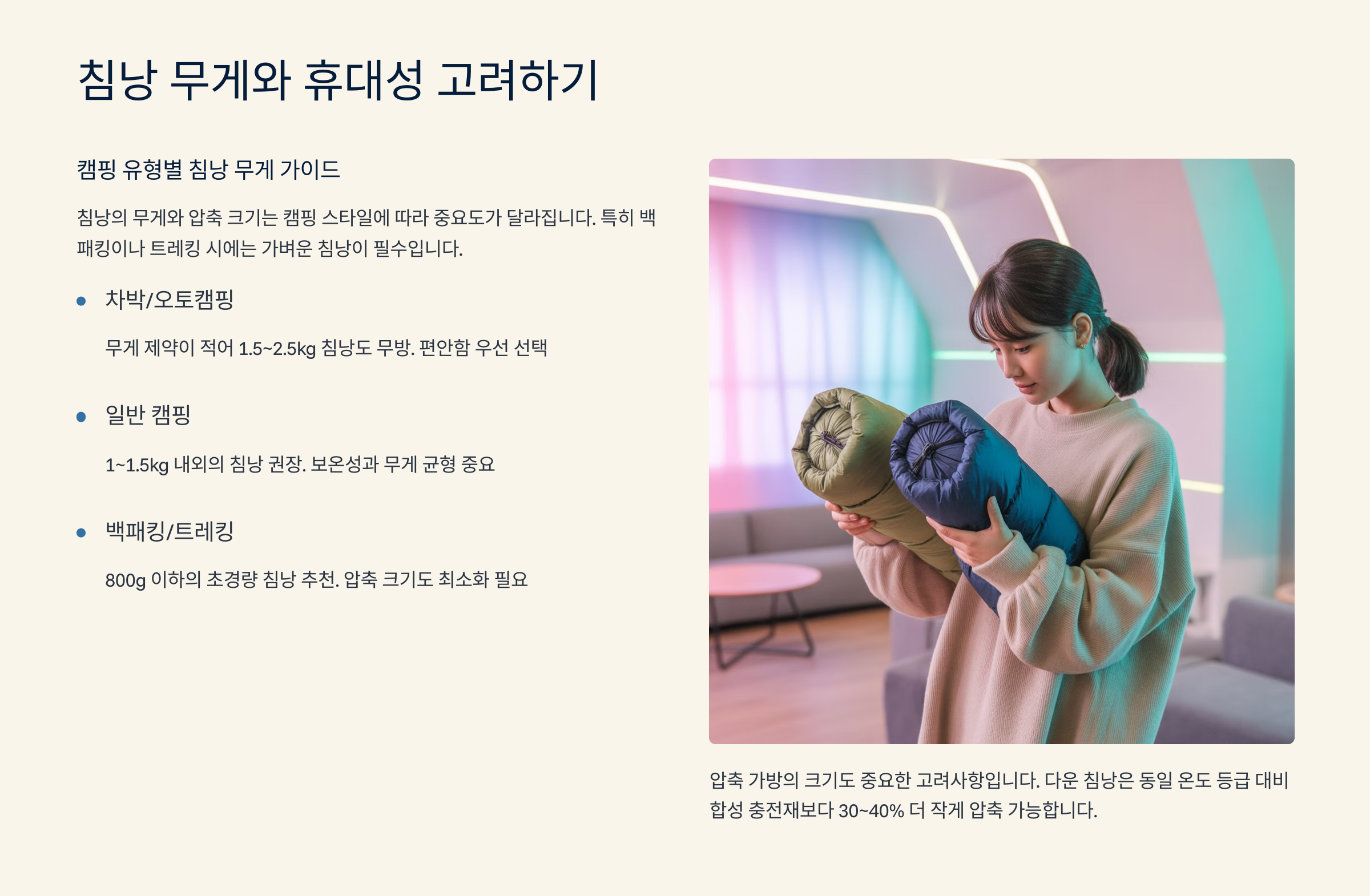 | 종류 | 충전재 | 무게(kg) | 압축 부피(L) | 적합 캠핑 스타일 |