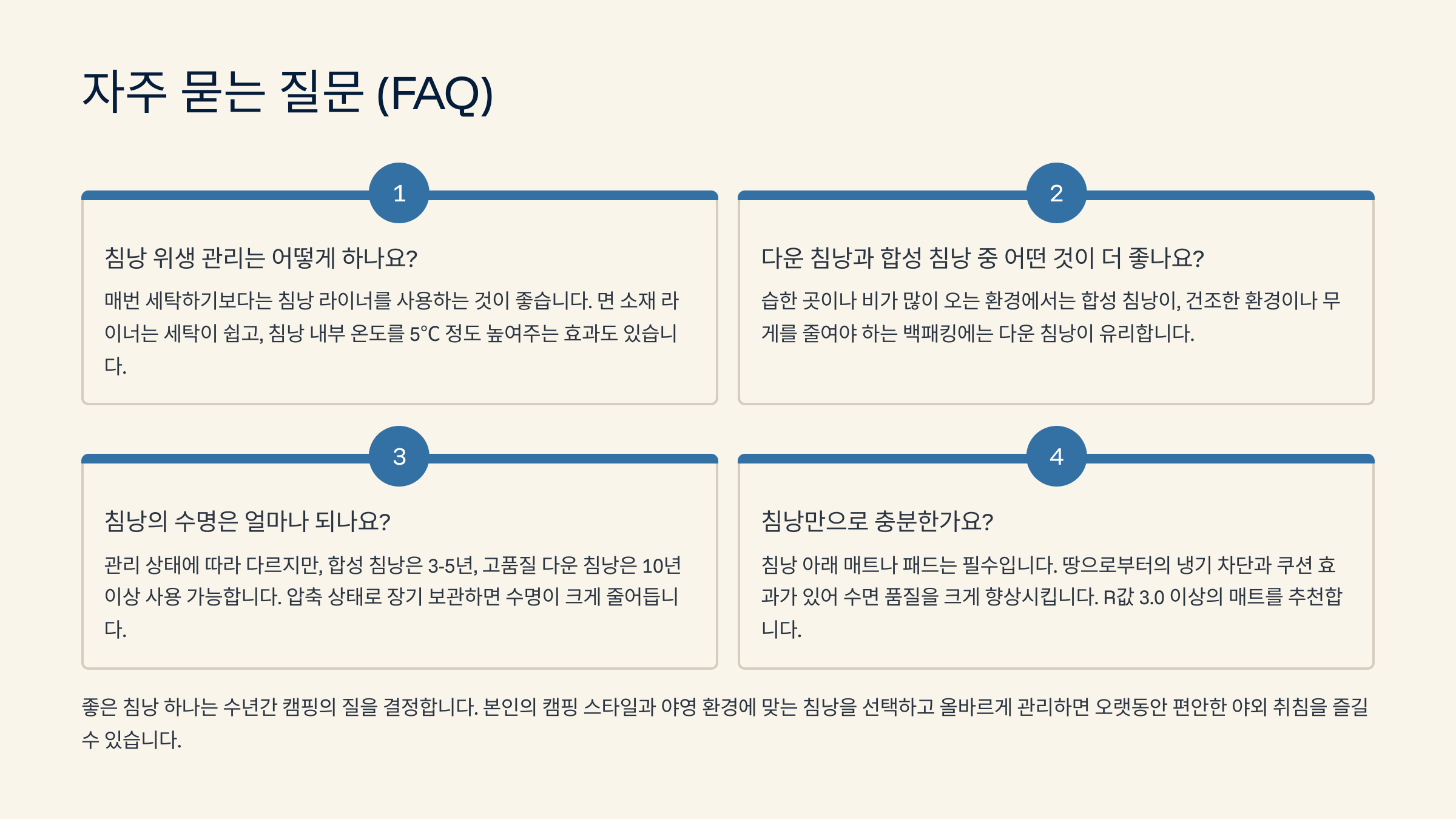A8. 캠핑 환경과 계절에 맞는 보온력, 무게, 휴대성, 그리고 관리 용이성을 종합적으로 고려하는 것이 중요해요.