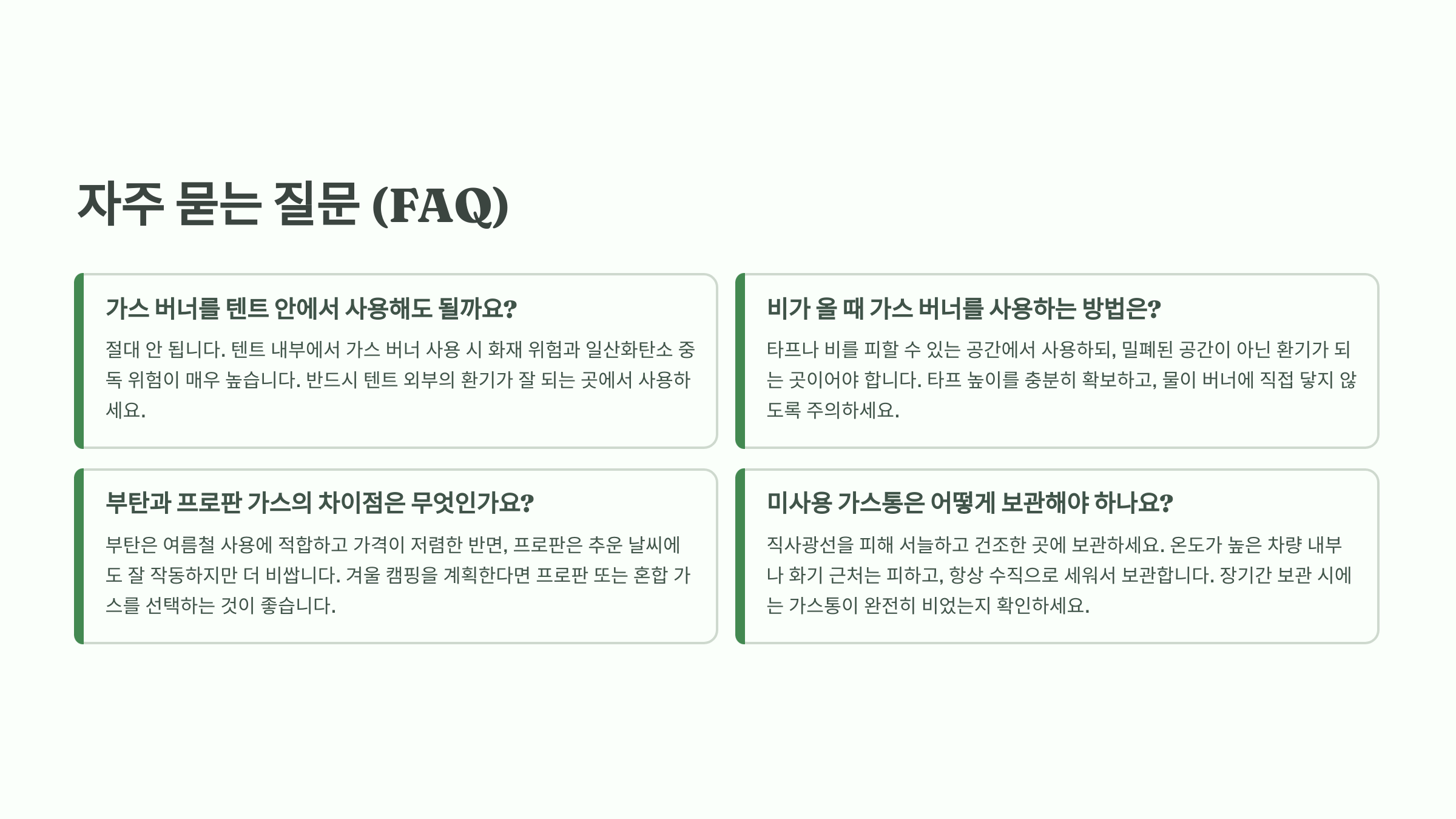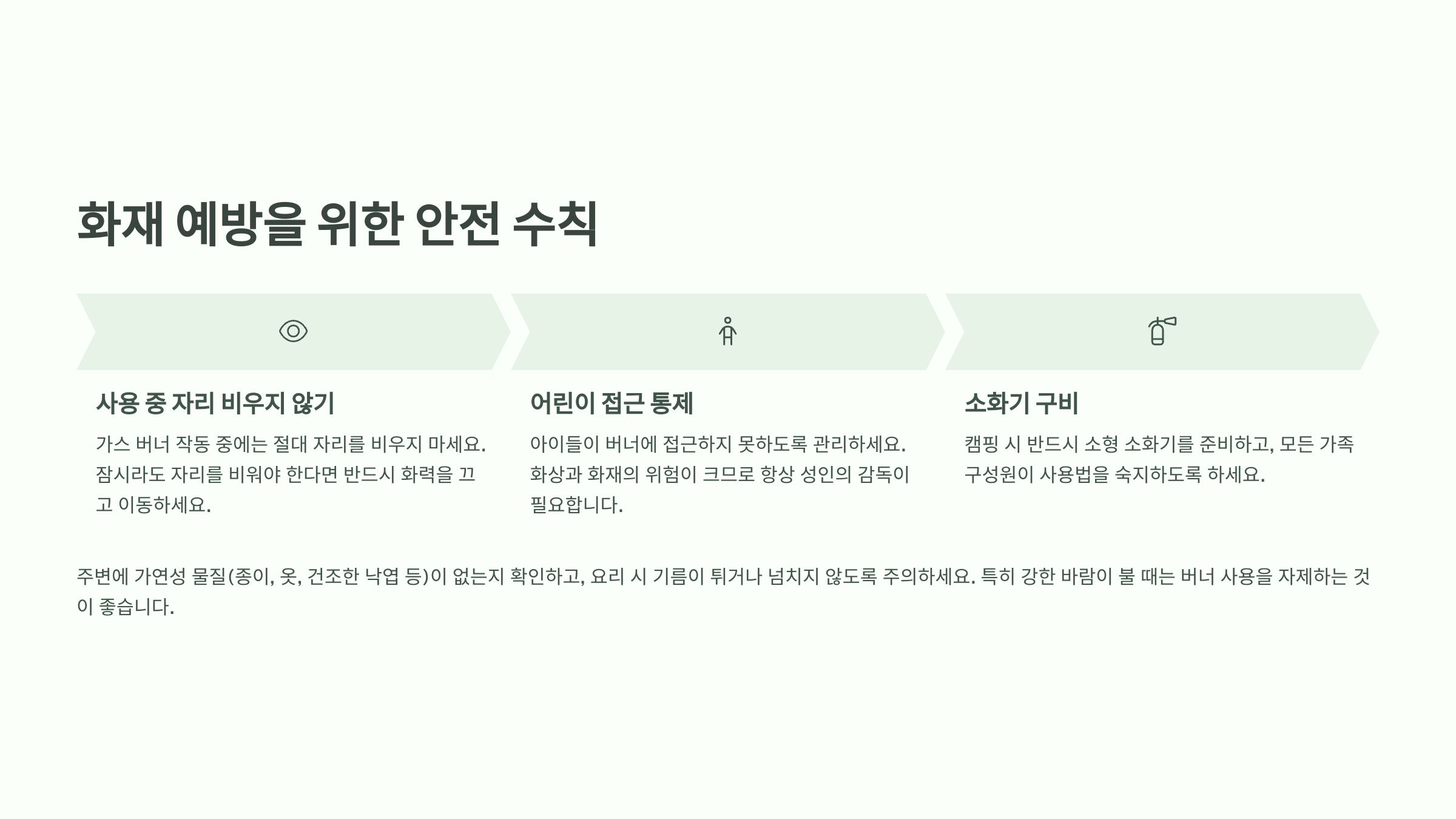 이런 안전 수칙을 꼼꼼히 지키면 캠핑 가스 버너 화재 걱정을 크게 줄일 수 있어요. 나의 느낌으로도 가장 중요한 부분이에요.