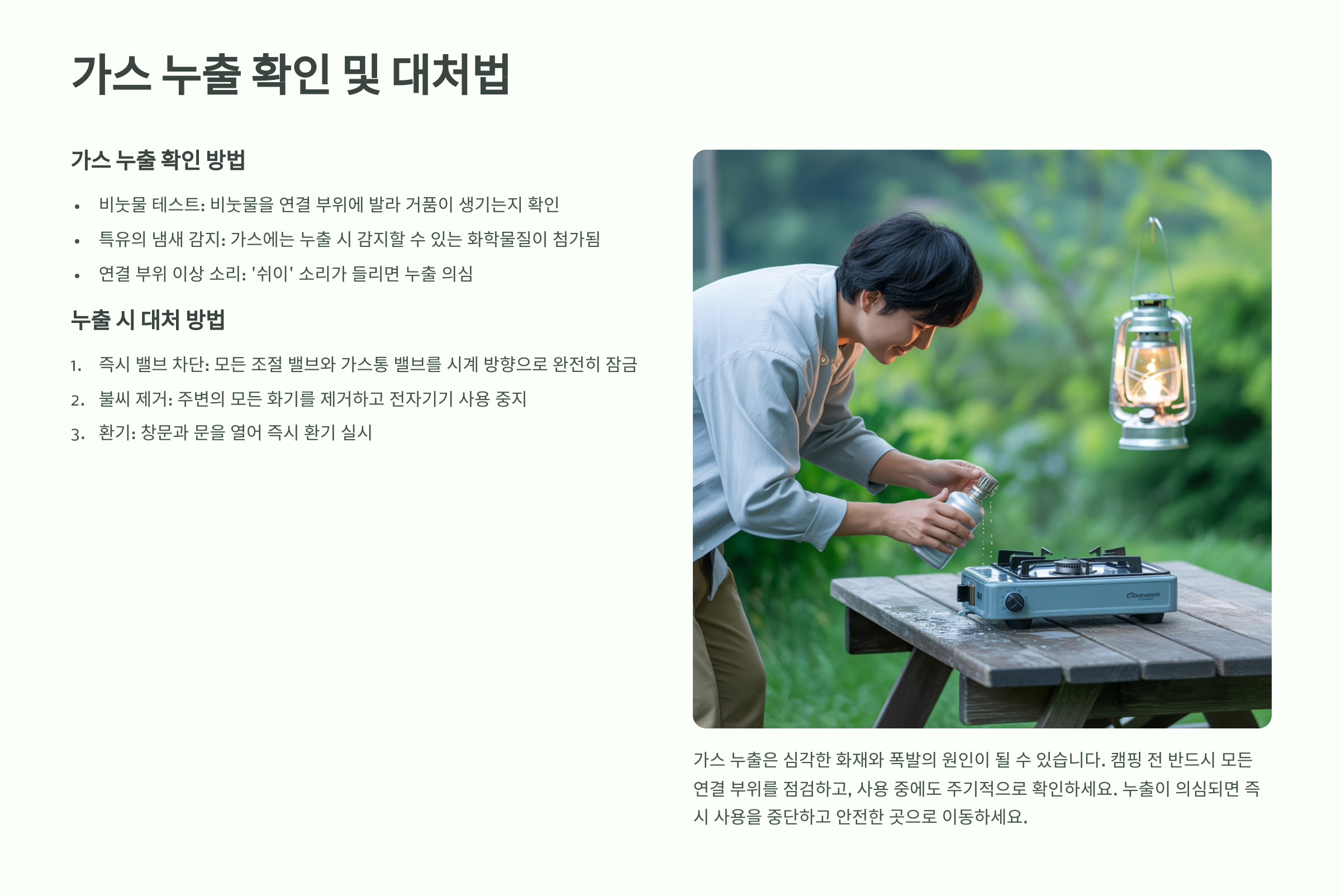 가스 누출 체크는 항상 생활화해야 하는 습관이에요. 나의 생각으로도 이 부분이 안전 캠핑의 핵심이라고 할 수 있어요.
