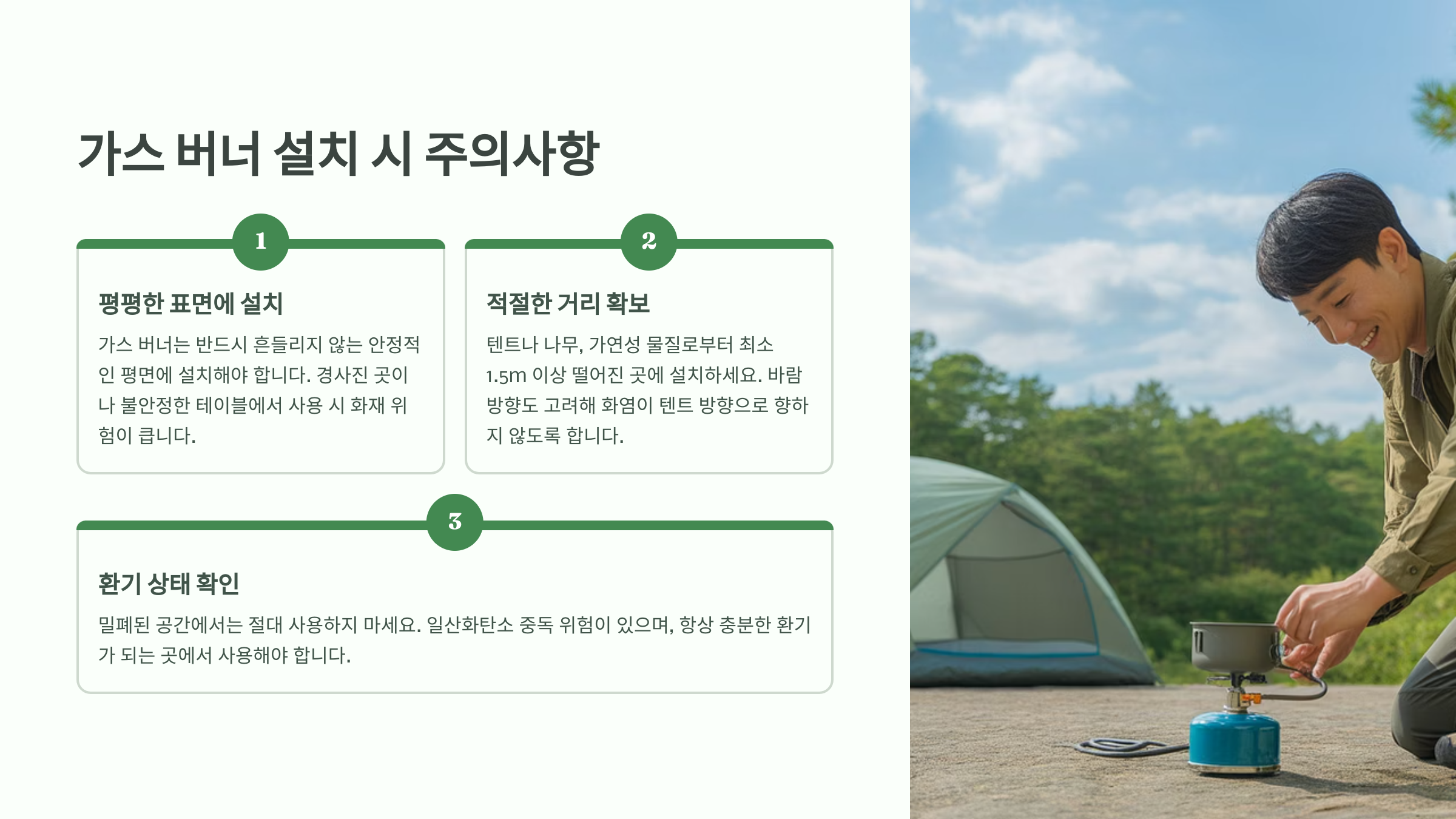 버너를 설치할 때는 평탄하고 안정적인 지면을 선택해야 해요. 흔들리거나 경사진 곳에 설치하면 가스통이 기울어져 누출 위험이 커져요. 항상 바람이 잘 통하는 야외에서 사용하세요.