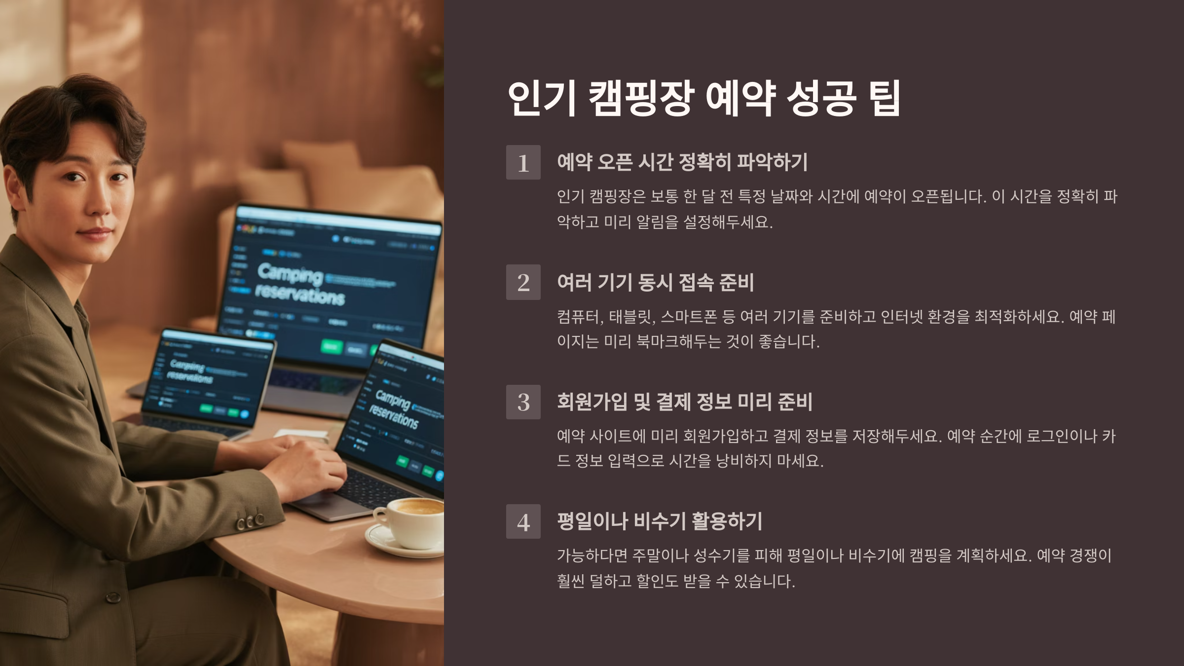 이러한 예약 난이도 때문에 많은 캠핑족들이 좌절하기도 합니다. 하지만 몇 가지 핵심 전략과 팁만 잘 활용한다면, 당신도 원하는 날짜에 원하는 캠핑장을 성공적으로 예약할 수 있습니다. 중요한 것은 단순한 운이 아니라, 철저한 사전 준비와 빠른 실행력에 있습니다.