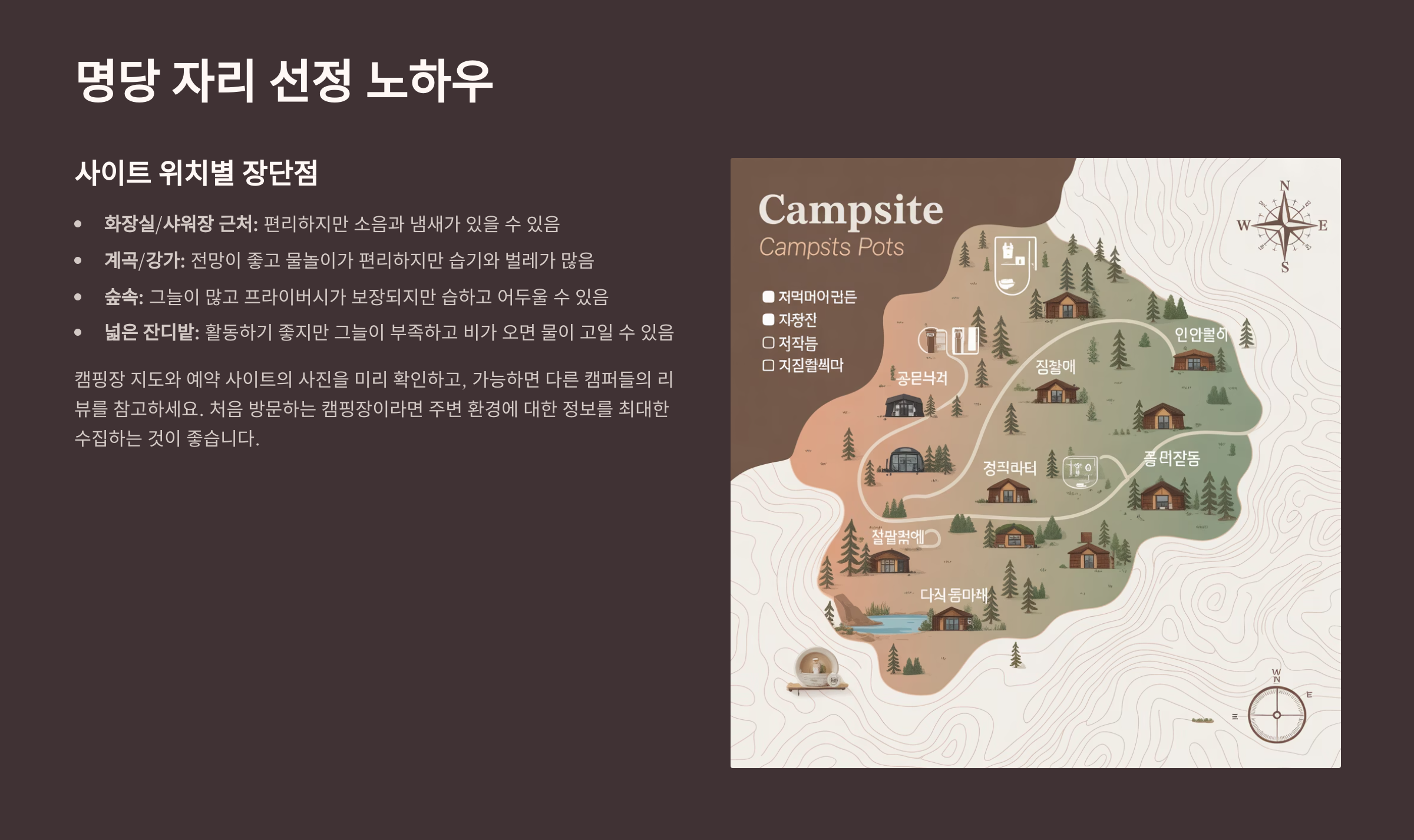 | 편의시설 인접 사이트 | 화장실, 개수대, 샤워실 가까운 곳 | 아이 동반 가족, 편의성 중시 |