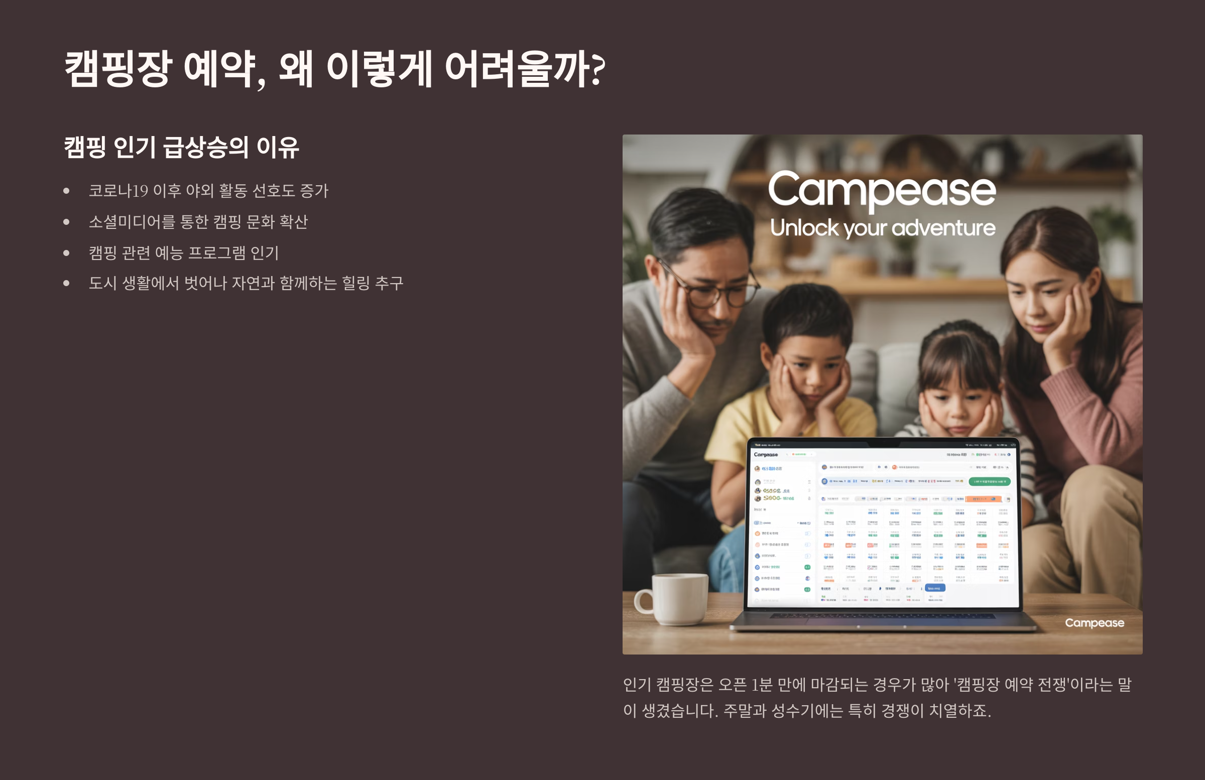 푸른 숲속, 맑은 공기, 밤하늘의 별을 보며 즐기는 캠핑은 많은 이들의 로망입니다. 하지만 인기 있는 캠핑장은 '피켓팅'이라는 말이 나올 정도로 예약 경쟁이 치열하죠. 특히 성수기 주말이나 연휴에는 예약 오픈과 동시에 마감되는 경우가 허다해서, 원하는 캠핑장에 가기란 하늘의 별 따기처럼 느껴지곤 합니다.