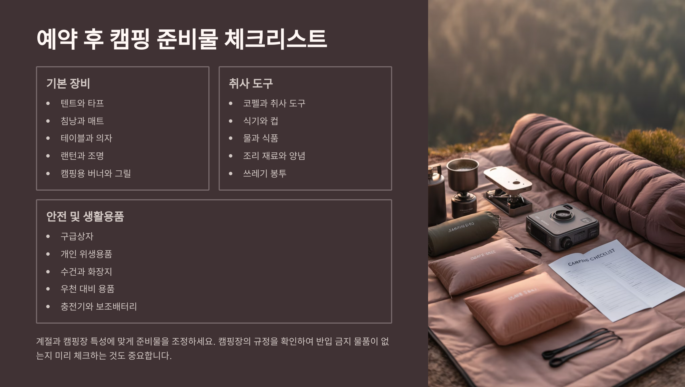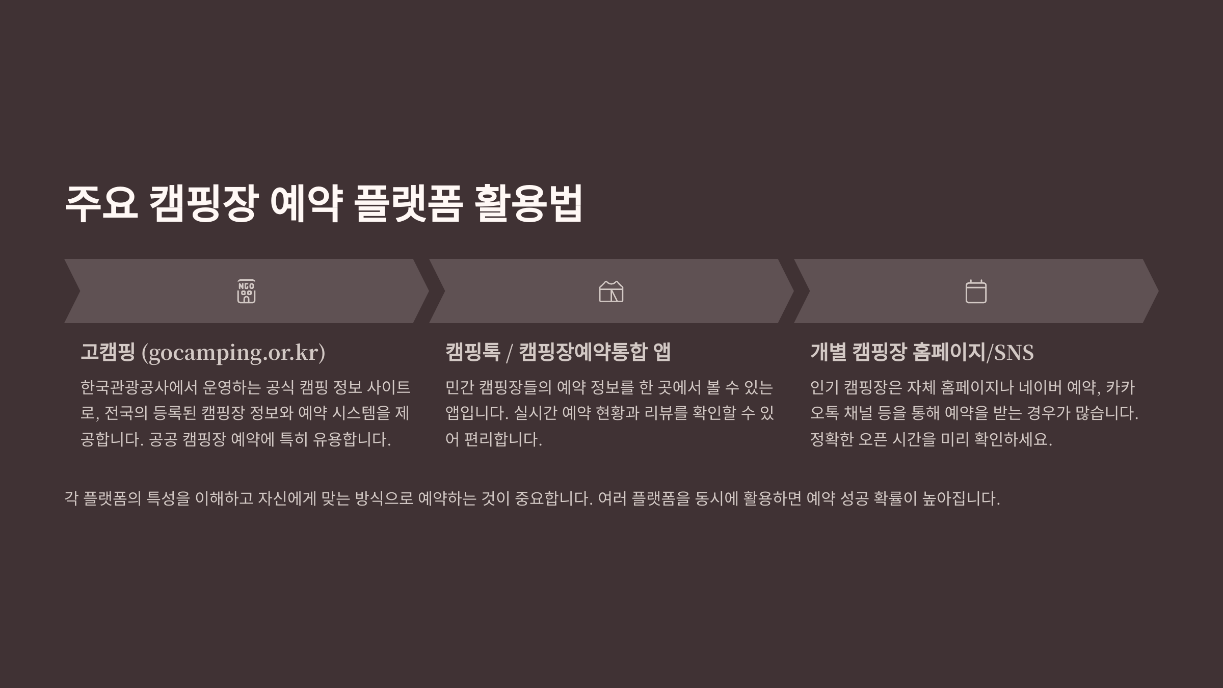 | 사전 정보 파악 | 예약 오픈 일시, 시간, 결제 방식 확인 | 캠핑장 홈페이지 및 커뮤니티 활용 |