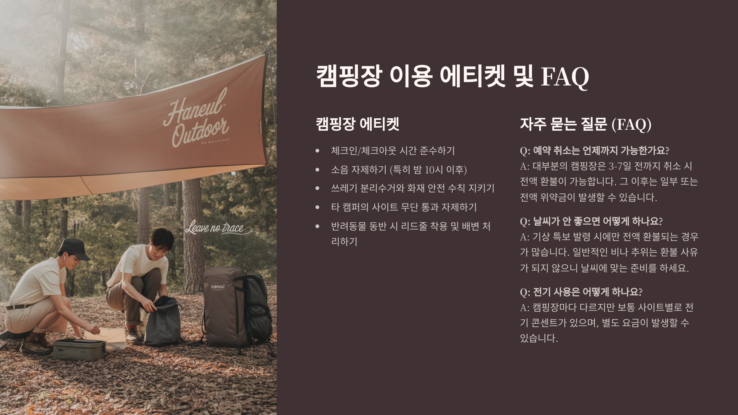 | 소음 주의 | 밤 10시 이후 정숙, 과도한 음주 자제 | 다른 캠퍼의 휴식 보장 |