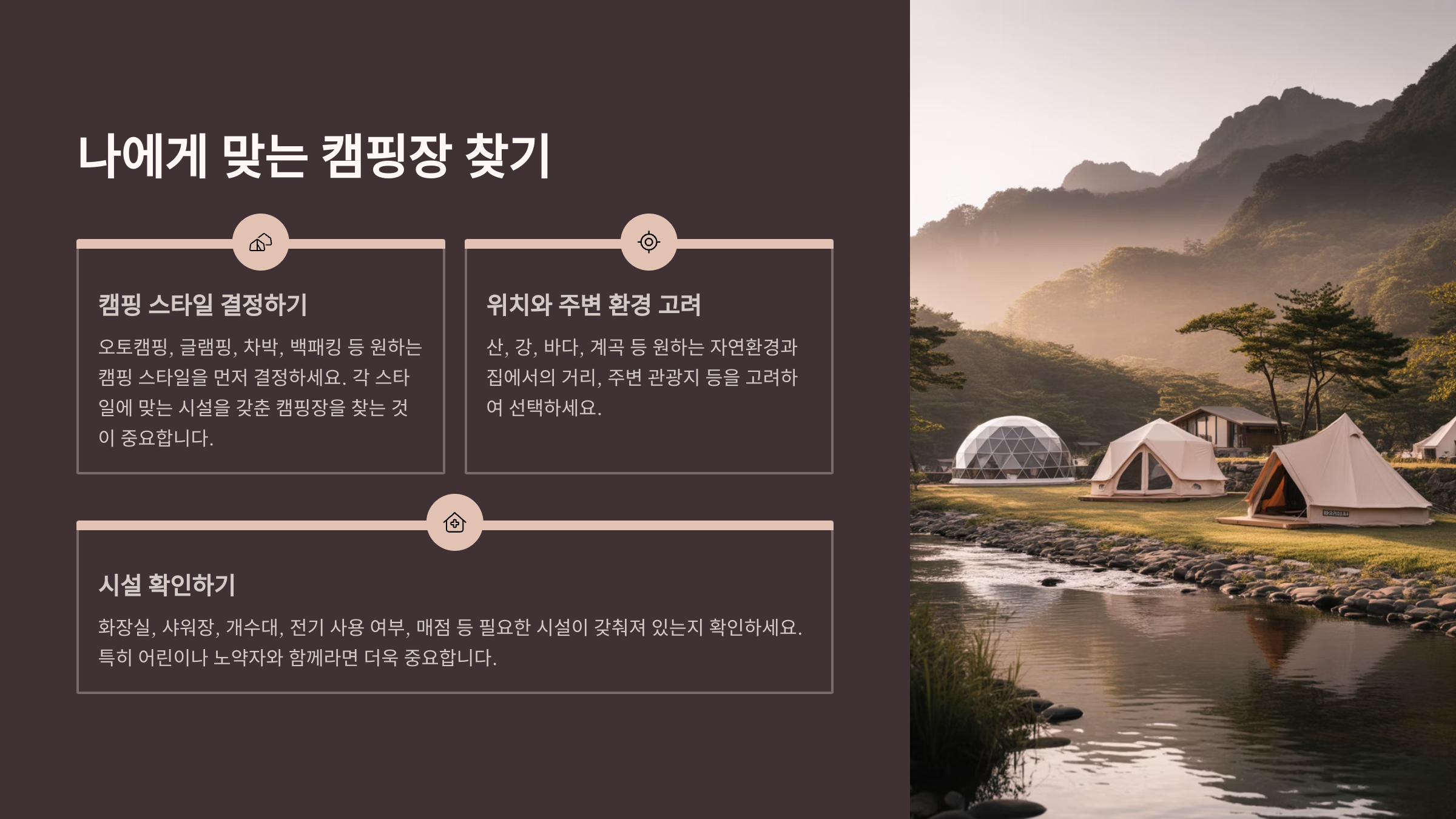 | 가족 캠핑 | 놀이터, 수영장, 키즈 프로그램 | 안전 시설, 편의점, 화장실 거리 |