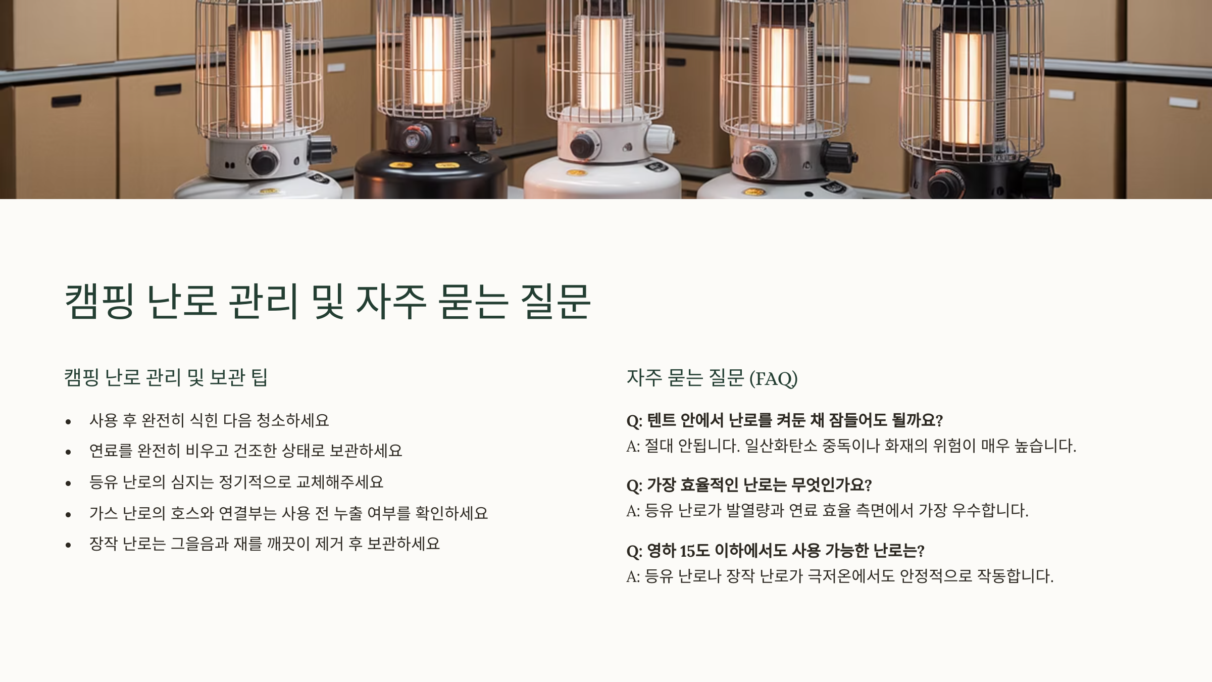| 가스 난로 | 가스통 분리 보관, 노즐 및 연결부 청소 | 가스 누출 여부 정기 확인, 습기 없는 곳 보관 |