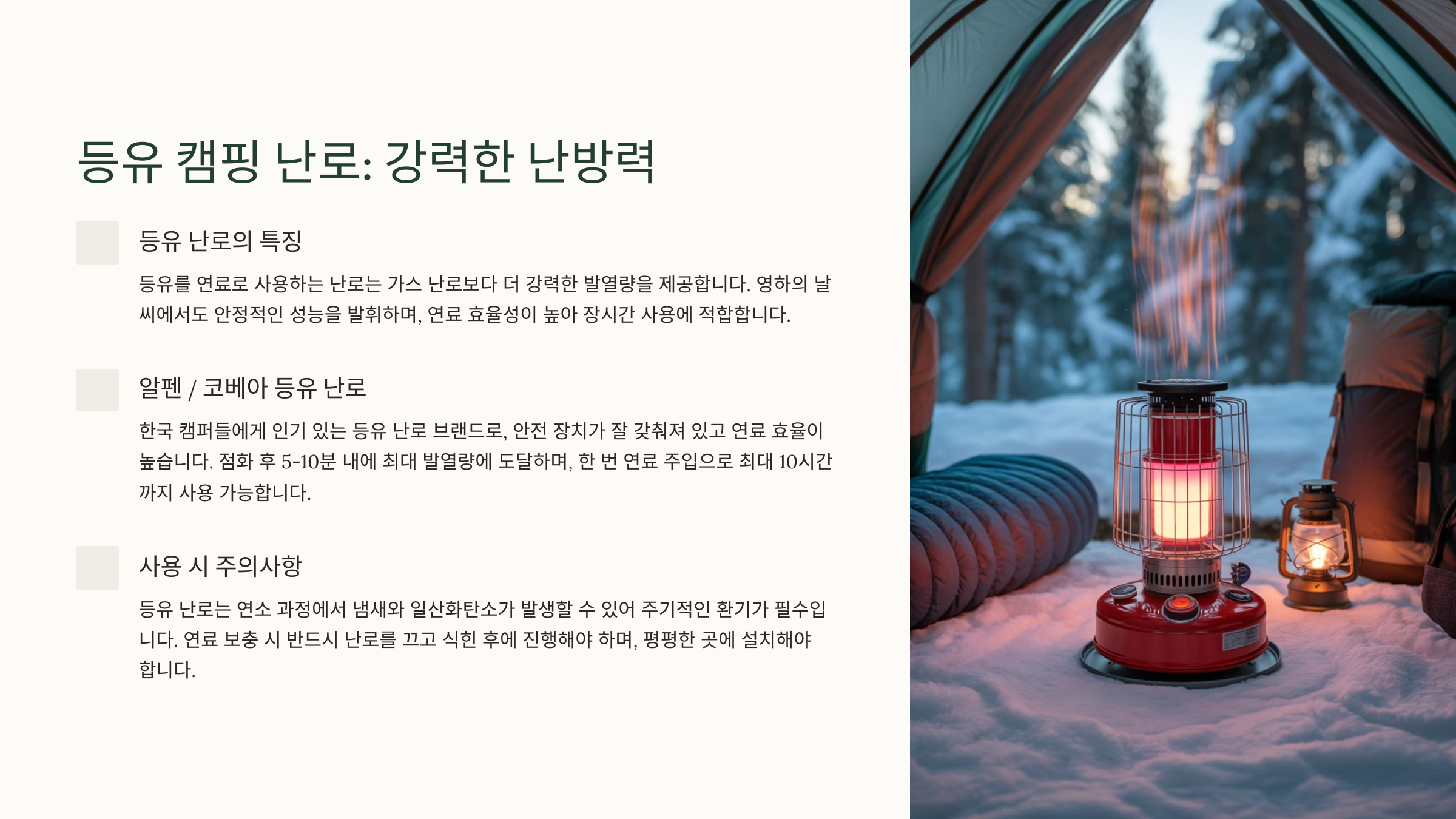 | 텐트 크기 | 소형(1~2인용)부터 대형(거실형 텐트)까지 | 소형: 가스 / 중형: 등유, 가스 / 대형: 등유, 우드 스토브 |