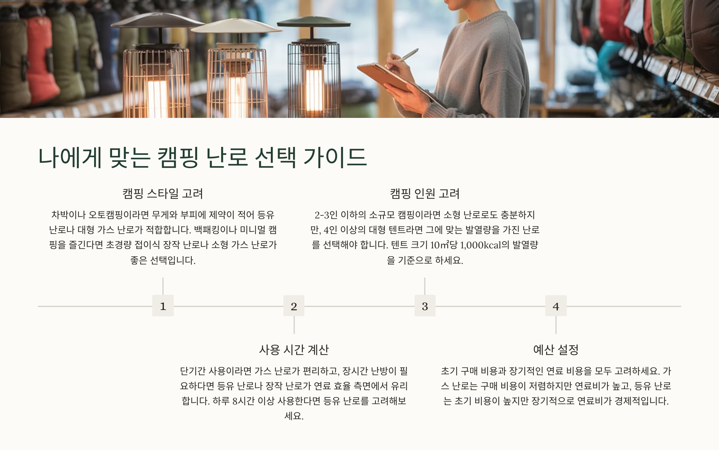 | 캠핑 스타일 | 미니멀, 오토캠핑, 백패킹, 감성 캠핑 | 미니멀: 가스 / 오토: 등유, 가스 / 백패킹: 가스 / 감성: 우드, 등유 |