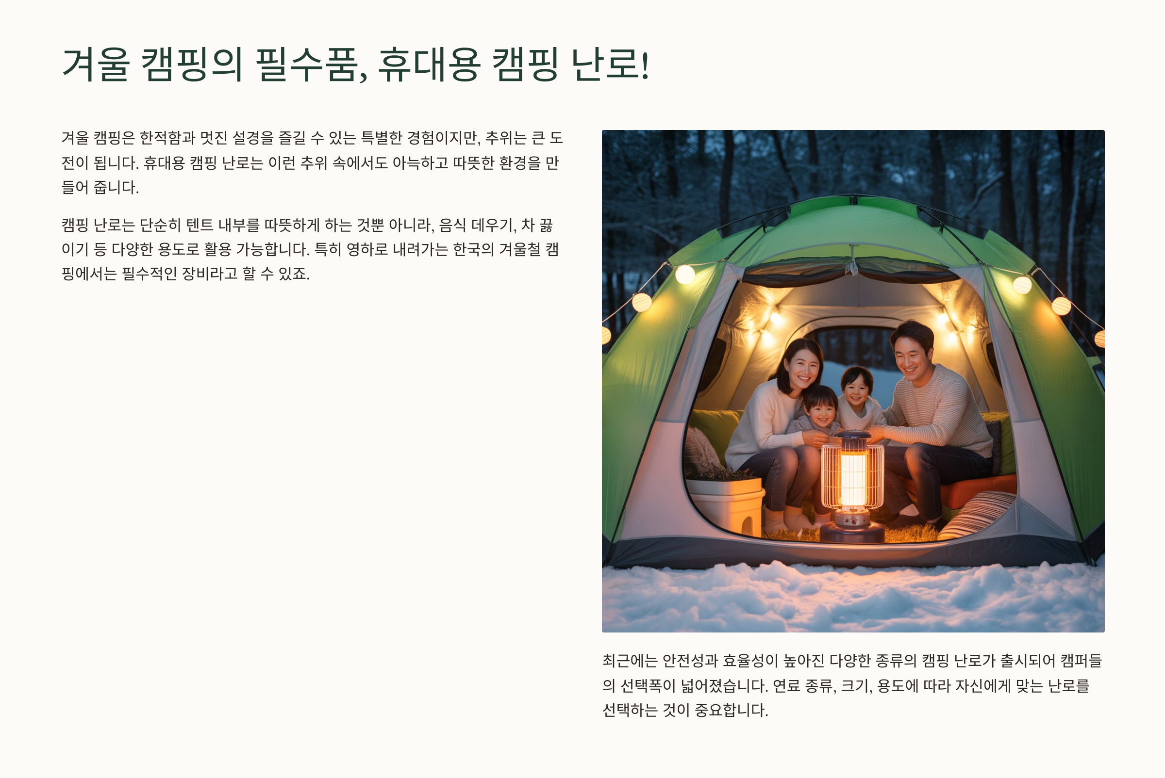 이 글에서는 추운 날씨에도 아늑하고 안전한 캠핑을 즐길 수 있도록, **인기 있는 휴대용 캠핑 난로의 종류별 특징과 장단점, 안전한 사용법, 그리고 실제 추천 모델**까지 상세하게 다룹니다. 여러분의 다음 캠핑이 따뜻하고 즐거운 추억으로 가득할 수 있도록, 난로 선택에 필요한 모든 정보를 제공해 드리겠습니다.
