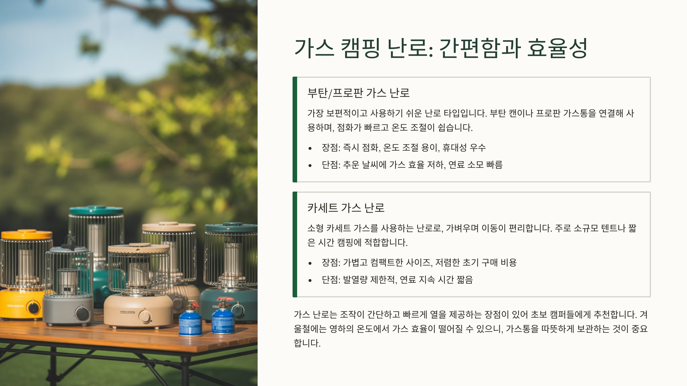 | 가스 난로 | 간편한 사용, 비교적 가벼움 | 휴대성 좋음, 즉각적인 온기 | 추운 날씨 효율 저하, 연료비 높을 수 있음 |