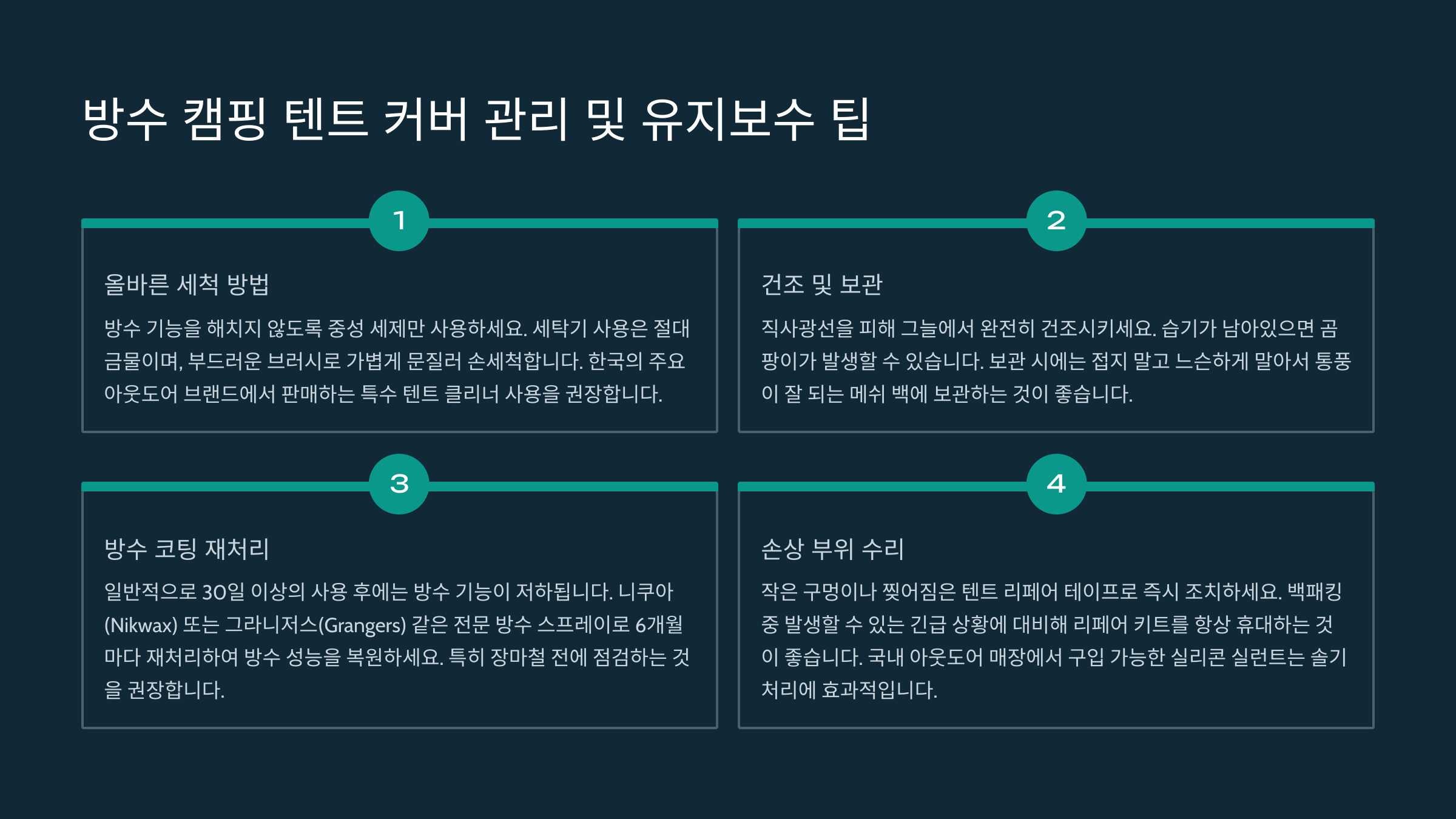 - 방수 캠핑 텐트 커버 관리 및 유지보수 팁