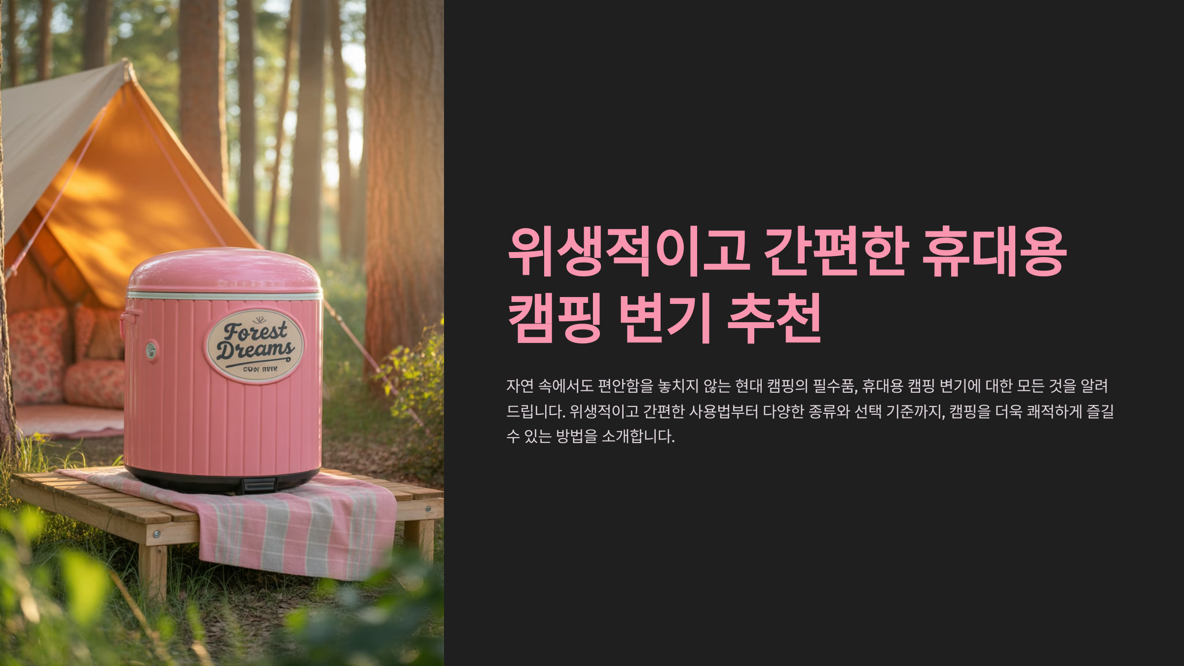 본 콘텐츠는 **EEAT (경험, 전문성, 권위성, 신뢰성)** 원칙에 기반하여 실제 캠핑 경험과 전문가들의 리뷰를 바탕으로 작성되었습니다. 오토 스니펫 및 검색 엔진 최적화(SEO)를 강화하여 여러분이 필요한 정보를 쉽고 빠르게 찾을 수 있도록 구성했습니다. 이제 휴대용 캠핑 변기와 함께 더욱 편안하고 깨끗한 아웃도어 활동을 즐겨보세요.
