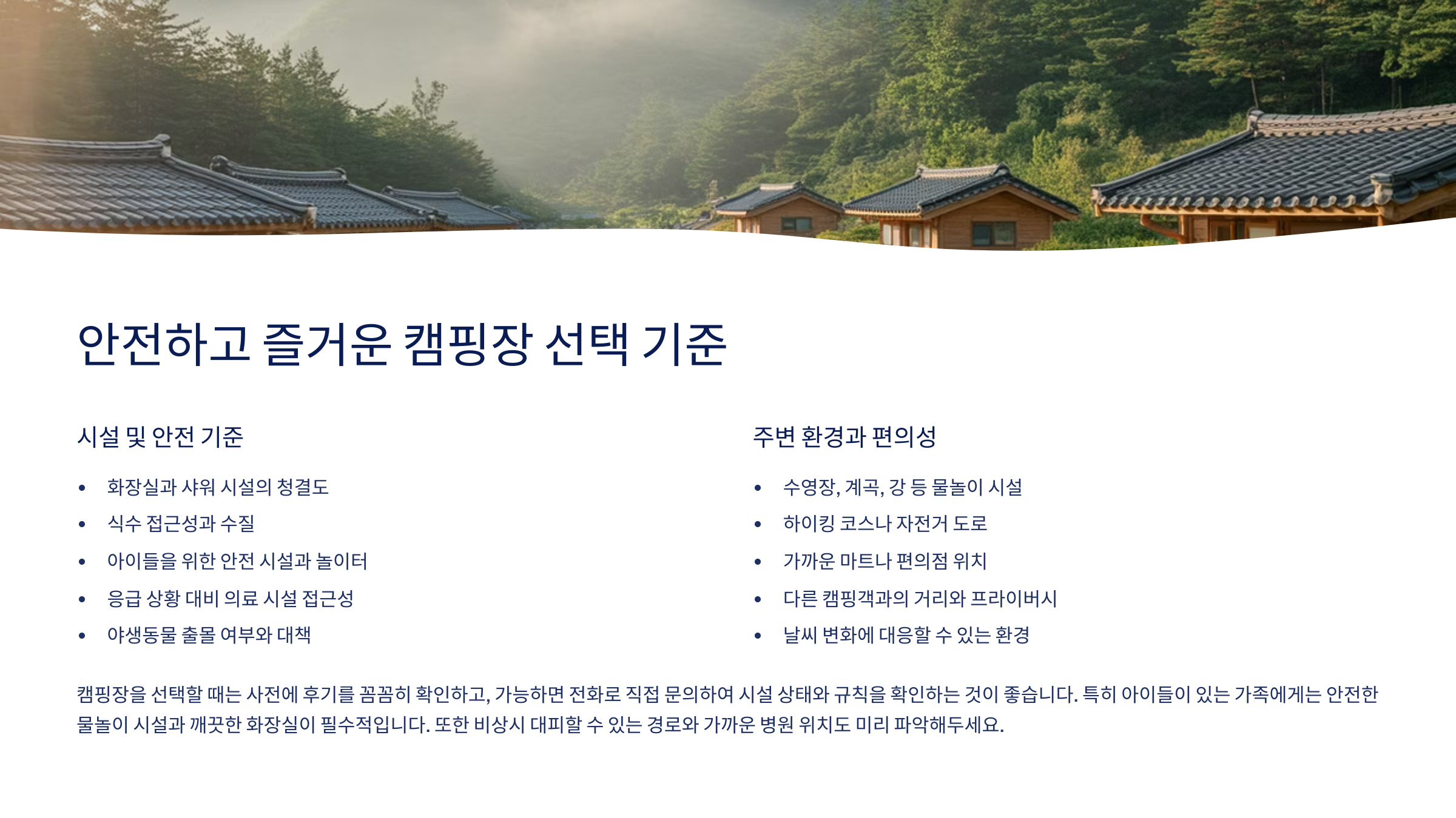 | 편의 시설 | 깨끗한 화장실, 온수 샤워실, 개수대 | 전기 사용 가능 여부, 매점 유무 |