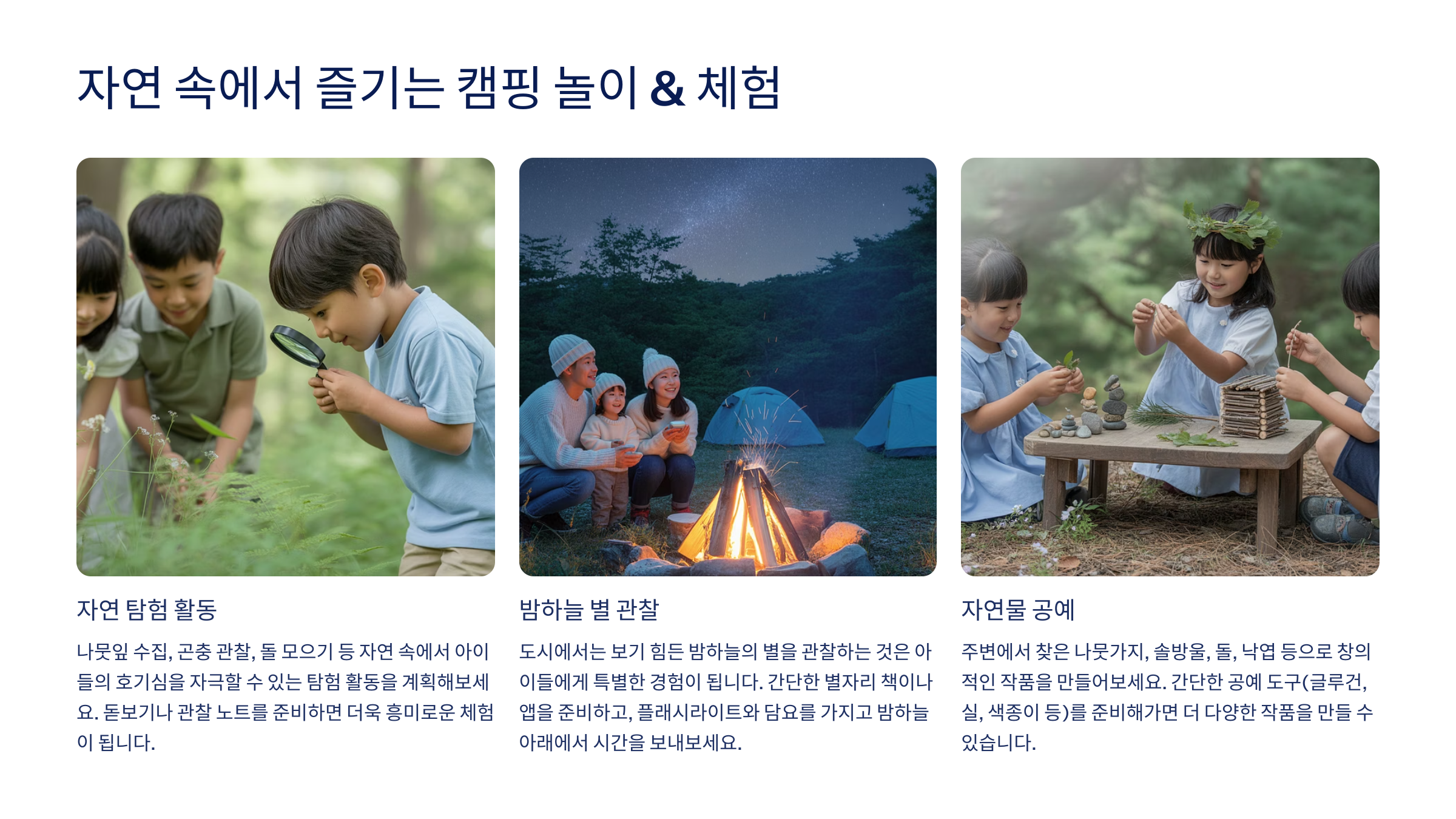 | 자연휴양림 캠핑 | 자연 속 힐링, 등산/산책 등 액티비티 | 자연 친화적, 활동적인 가족 |