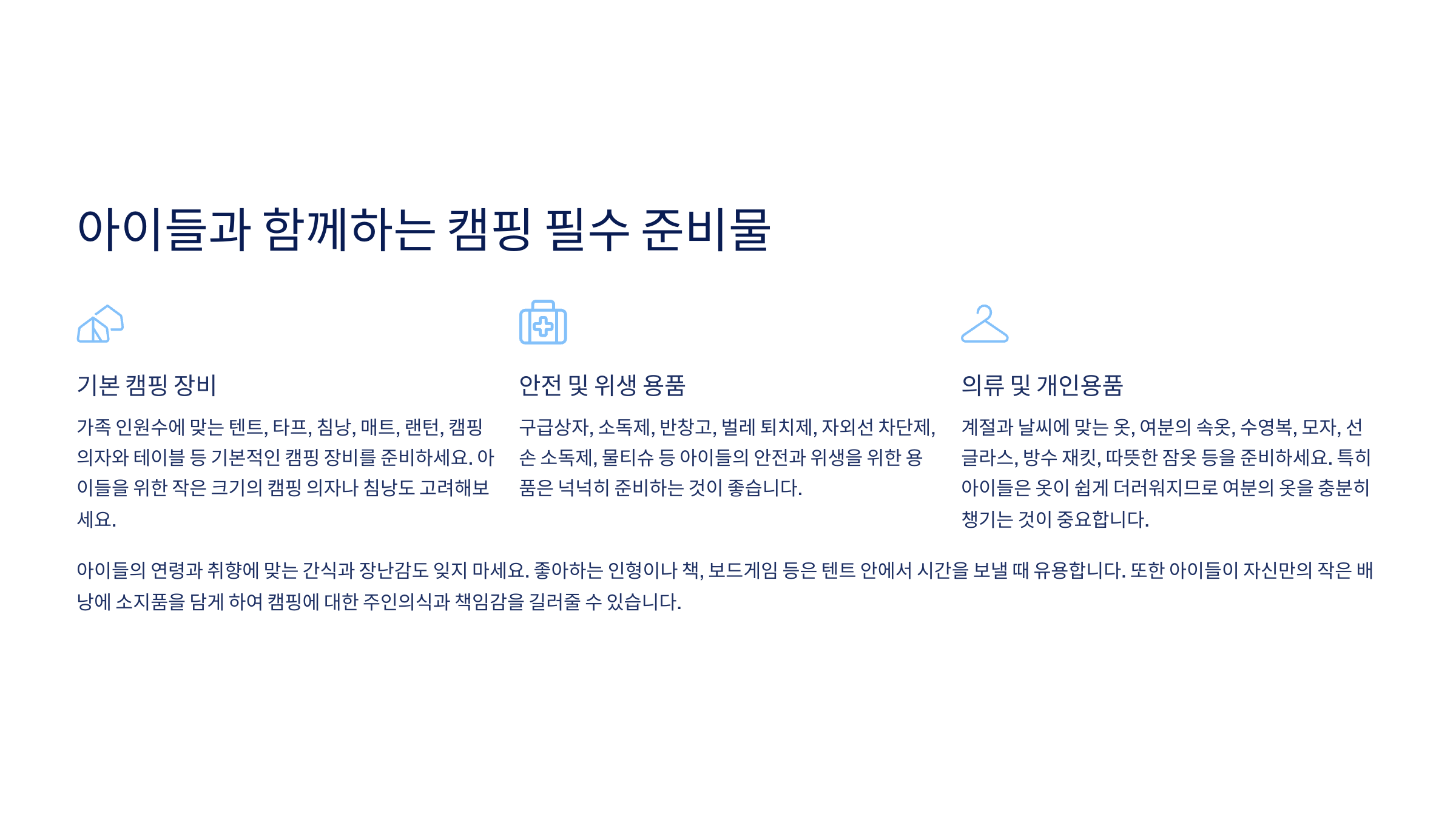 | 미니멀 캠핑 | 최소한의 장비로 떠나는 간편 캠핑 | 캠핑 경험이 있거나 짐을 줄이고 싶은 가족 |