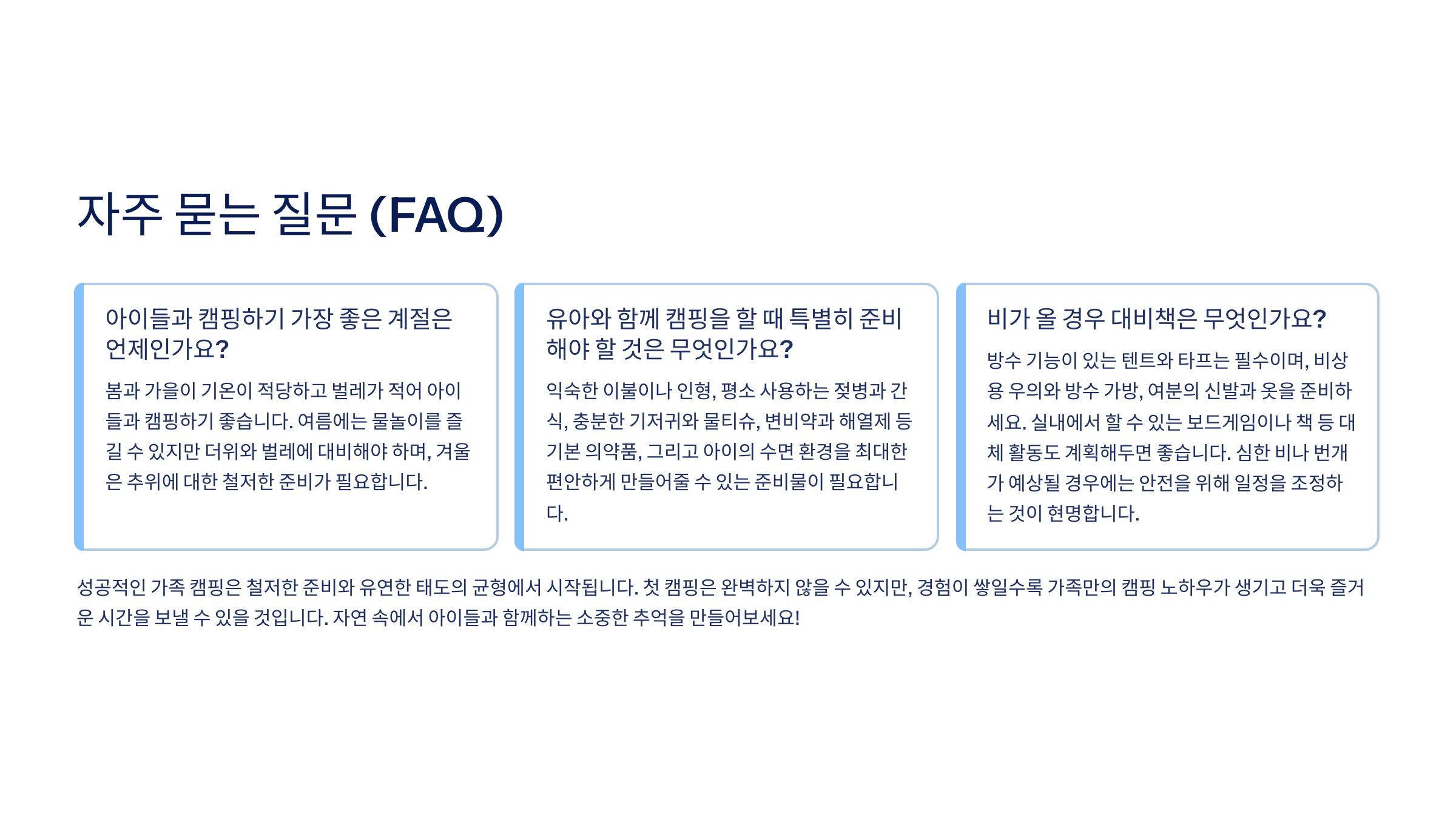 | 글램핑/카라반 | 장비 없이 편안하게 즐기는 캠핑 | 캠핑 장비가 없거나 간편함을 선호하는 가족 |