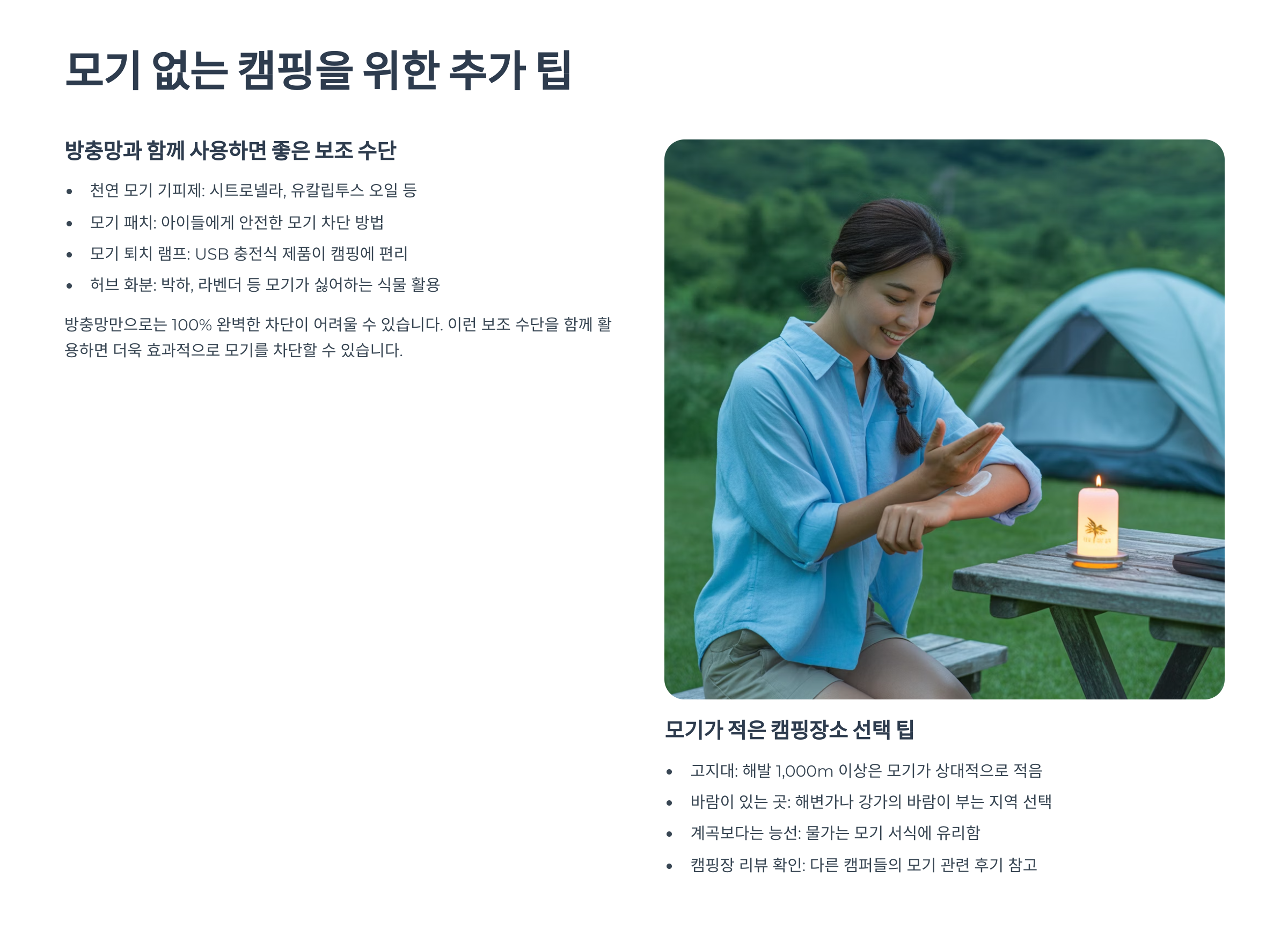 방충망 외에도 캠핑 시 모기 차단에 도움을 주는 다양한 보조 솔루션들이 있습니다. 모기향이나 전자 모기향은 좁은 공간에서 효과적이며, 특히 모기향 거치대를 활용하면 더욱 안전하게 사용할 수 있습니다. 휴대용 벌레 퇴치 램프(모기 퇴치 램프)는 UV-LED 등을 이용해 벌레를 유인하여 제거하는 방식으로, 밤에 텐트 주변에 설치하면 효과적입니다. 모기 퇴치 스프레이나 스티커, 팔찌 등 개인용 기피제도 필수적으로 챙겨야 합니다. 이러한 보조 용품들을 방충망과 함께 사용하면 모기 없는 쾌적한 캠핑 환경을 더욱 완벽하게 조성할 수 있습니다.