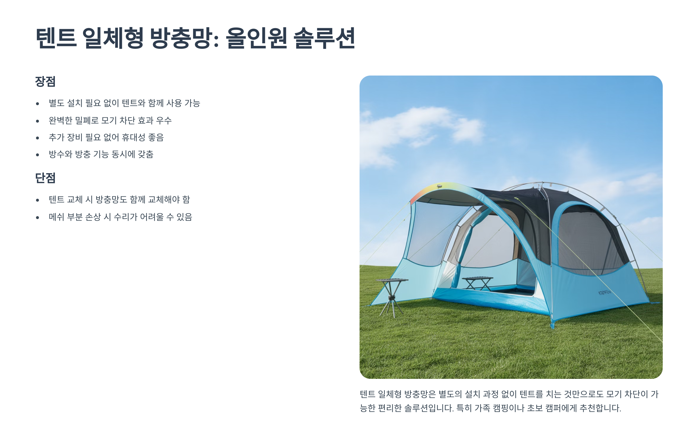 | 편의성 | 텐트 설치와 동시에 모기장 기능 제공 | 찢어지거나 손상 시 텐트 전체 수리 필요 |
