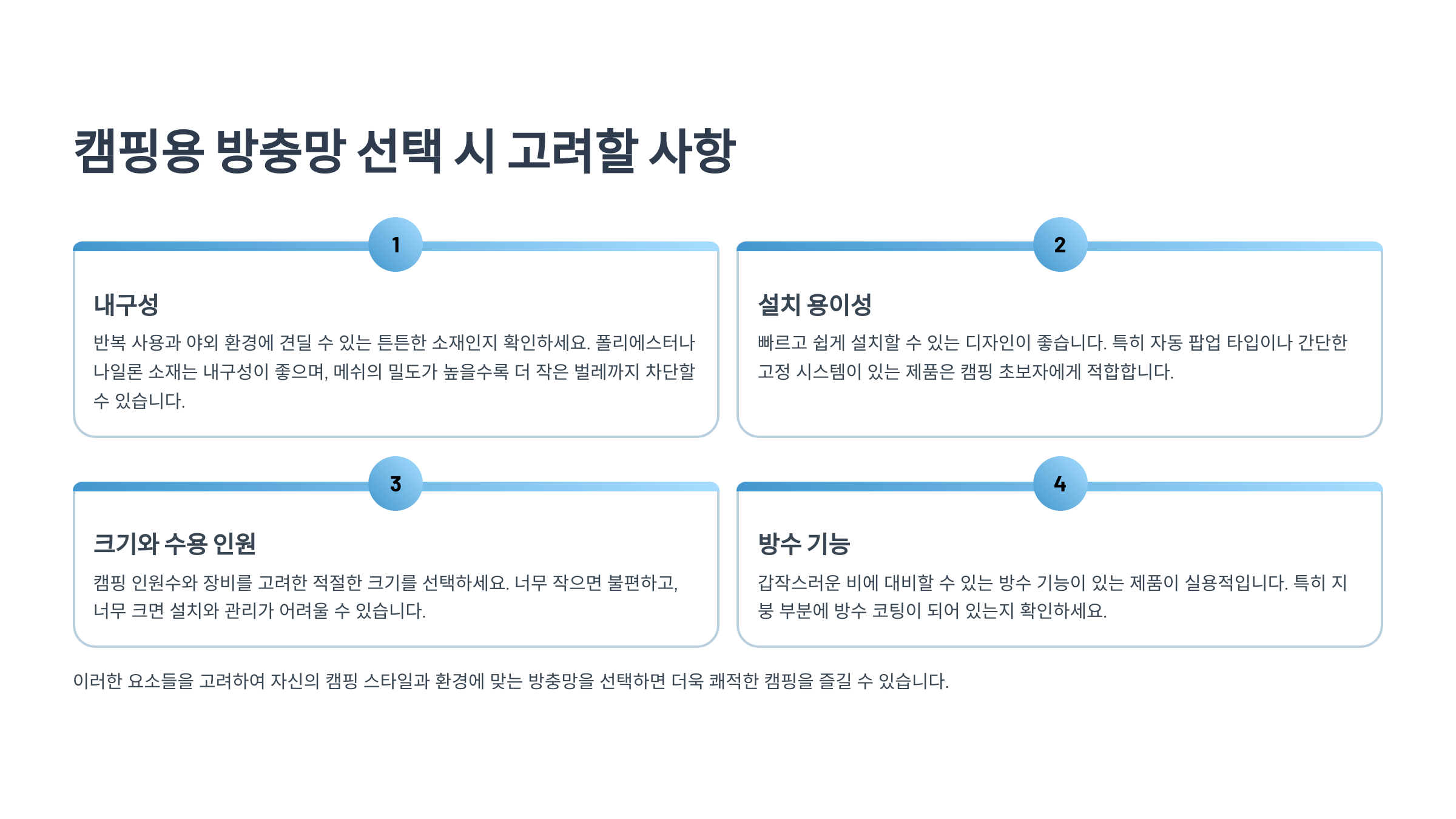 캠핑용 방충망을 선택할 때는 몇 가지 핵심 기준을 고려해야 합니다. 첫째, **모기 차단 성능**입니다. 망의 촘촘함(메쉬 사이즈)을 확인하여 모기가 침투할 틈이 없는지 살펴야 합니다. 둘째, **설치 용이성**입니다. 캠핑 현장에서 쉽고 빠르게 설치하고 해체할 수 있는 제품이 좋습니다. 셋째, **휴대성과 수납성**입니다. 접었을 때 부피와 무게가 적당하여 캠핑 장비와 함께 부담 없이 가져갈 수 있는지 중요합니다. 넷째, **내구성**입니다. 찢어짐이나 손상에 강한 소재로 만들어졌는지, 지퍼 등 부속품의 퀄리티도 확인해야 합니다. 마지막으로 **캠핑 스타일에 맞는 형태**를 고려하여 오토캠핑, 백패킹, 차박 등에 적합한 제품을 선택해야 합니다.