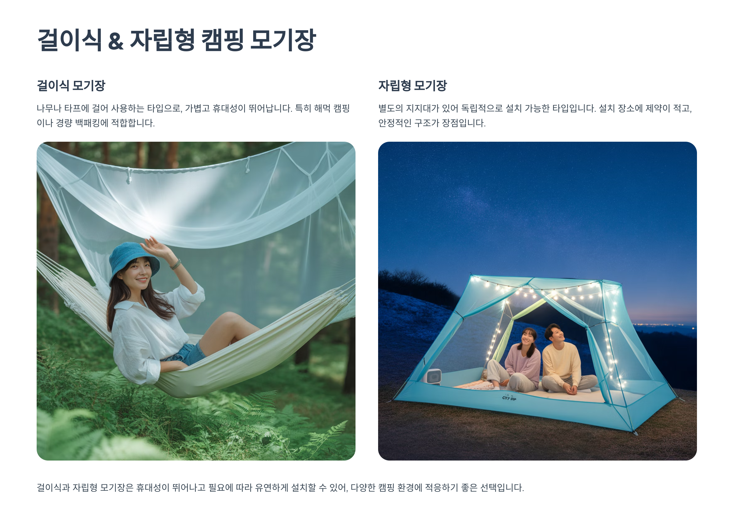 | 자립형 모기장 | 자체 폴대/지지대로 자립 | 설치 장소 제약 적음, 안정적, 야전침대와 호환 | 걸이식보다 부피/무게 다소 있음, 가격 높음 |