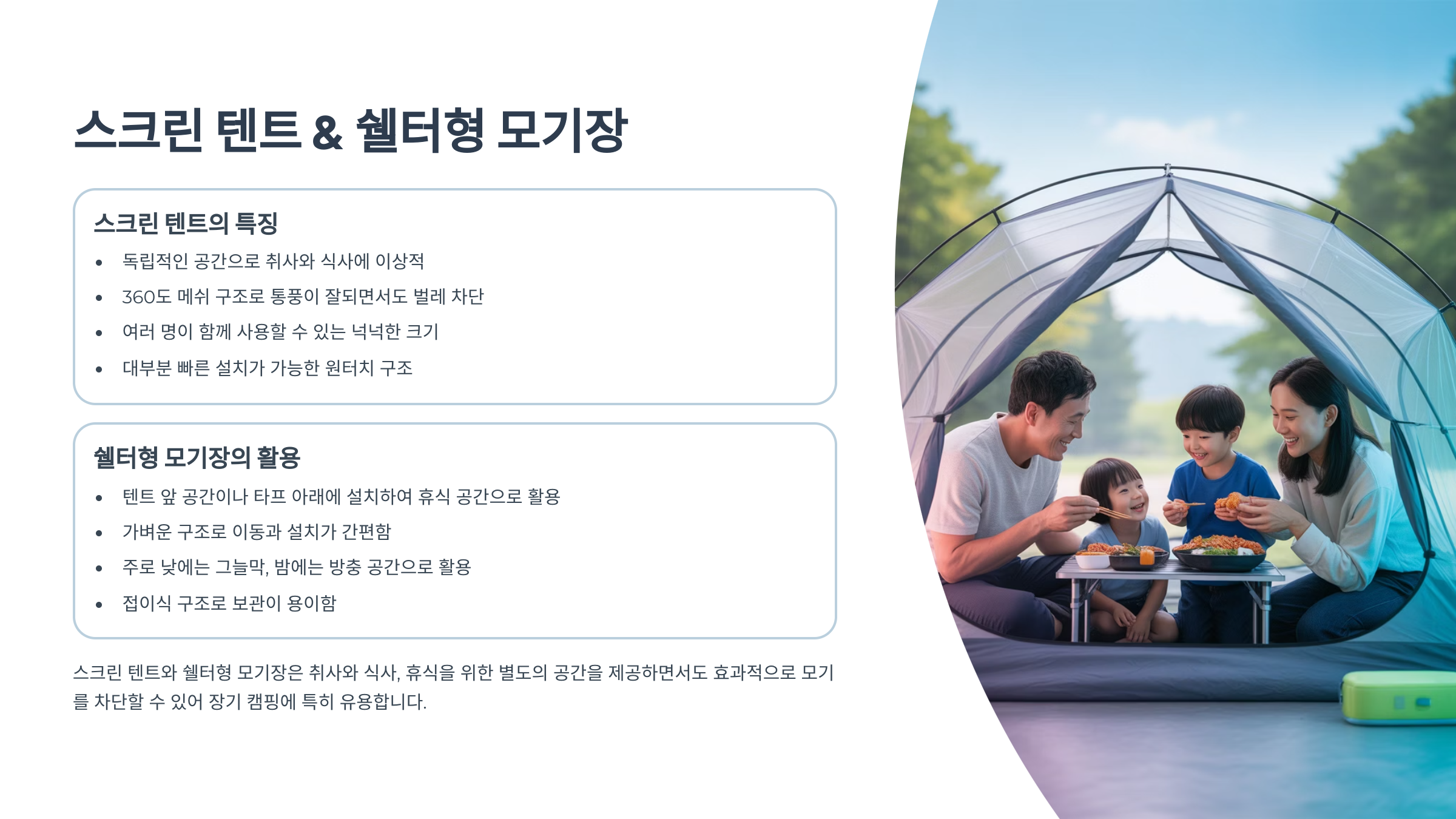 | 스크린 텐트 | 독립형 구조, 사방 방충망 | 넓은 생활 공간 확보, 개방감 우수, 단체 활동 적합 | 부피와 무게가 크고 무거움, 설치 시간 소요 |