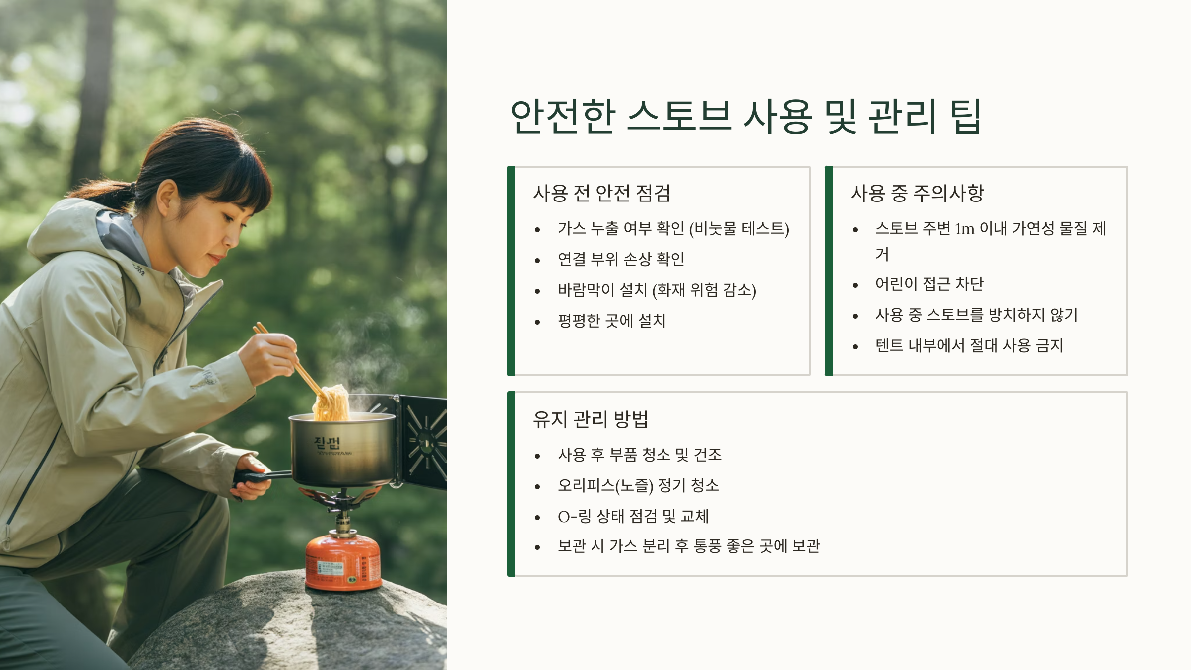 휴대용 가스 스토브는 편리하지만, 가스를 사용하는 제품인 만큼 안전 수칙을 철저히 지키는 것이 매우 중요합니다. 첫째, 항상 평평하고 단단한 지면에서 사용하세요. 불안정한 곳에서의 사용은 전복으로 인한 화재나 화상으로 이어질 수 있습니다. 둘째, 환기가 잘 되는 곳에서 사용하세요. 밀폐된 공간에서 사용하면 일산화탄소 중독의 위험이 있습니다. 텐트 안이나 차량 내부에서의 사용은 절대 금지입니다. 셋째, 연료통을 과열시키지 마세요. 직사광선이 내리쬐는 곳이나 화기 근처에 두지 않도록 합니다. 넷째, 사용 후에는 반드시 연료 밸브를 잠그고, 연료통을 분리하여 보관하세요. 정기적인 점검과 청소는 스토브의 수명을 연장하고 안전성을 유지하는 데 도움이 됩니다.
