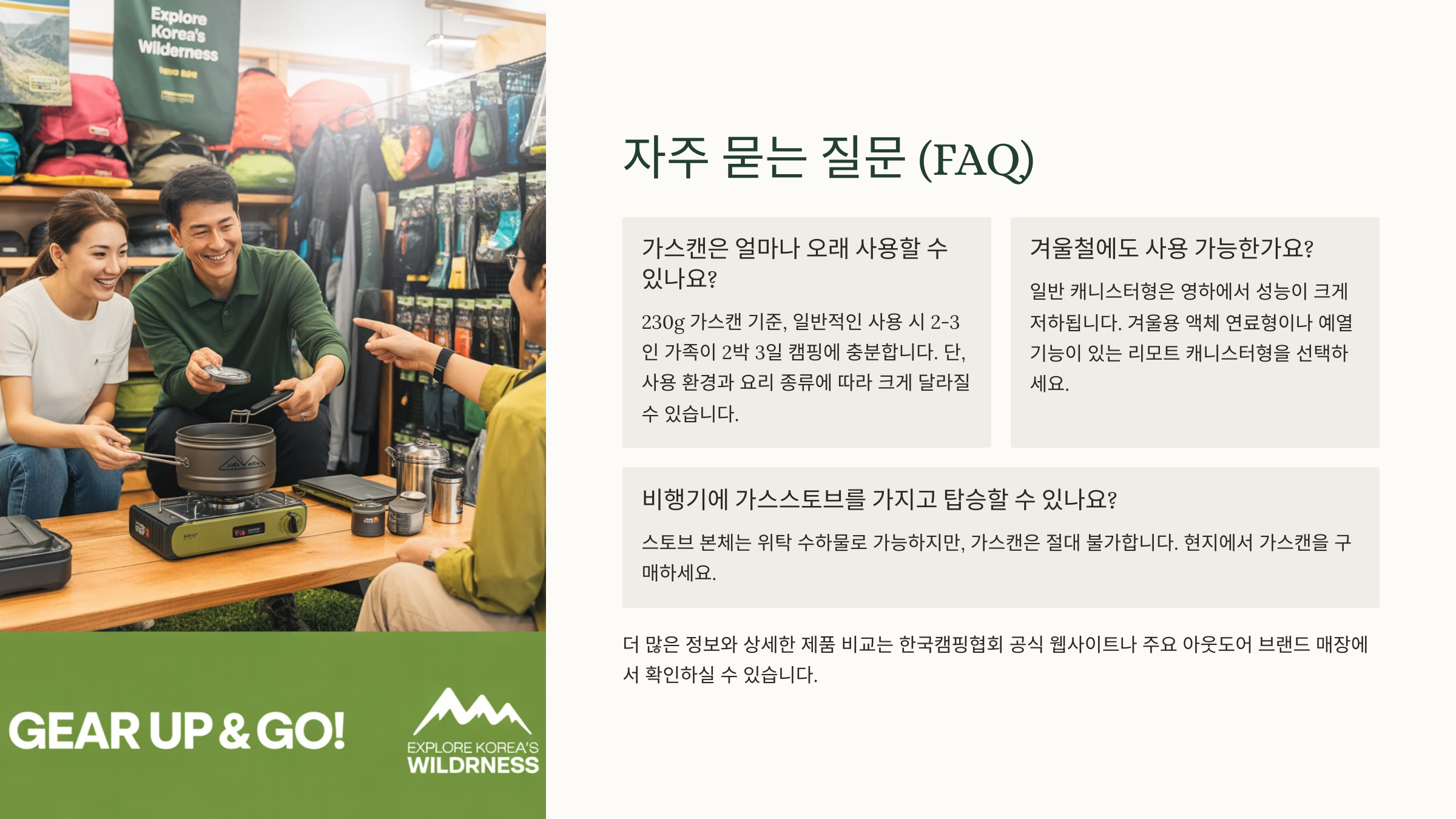 | 연료 호환성 | 이소부탄, 부탄, 프로판, 액출 가능 여부 | 계절별 사용 환경 고려 (동계/하계) |