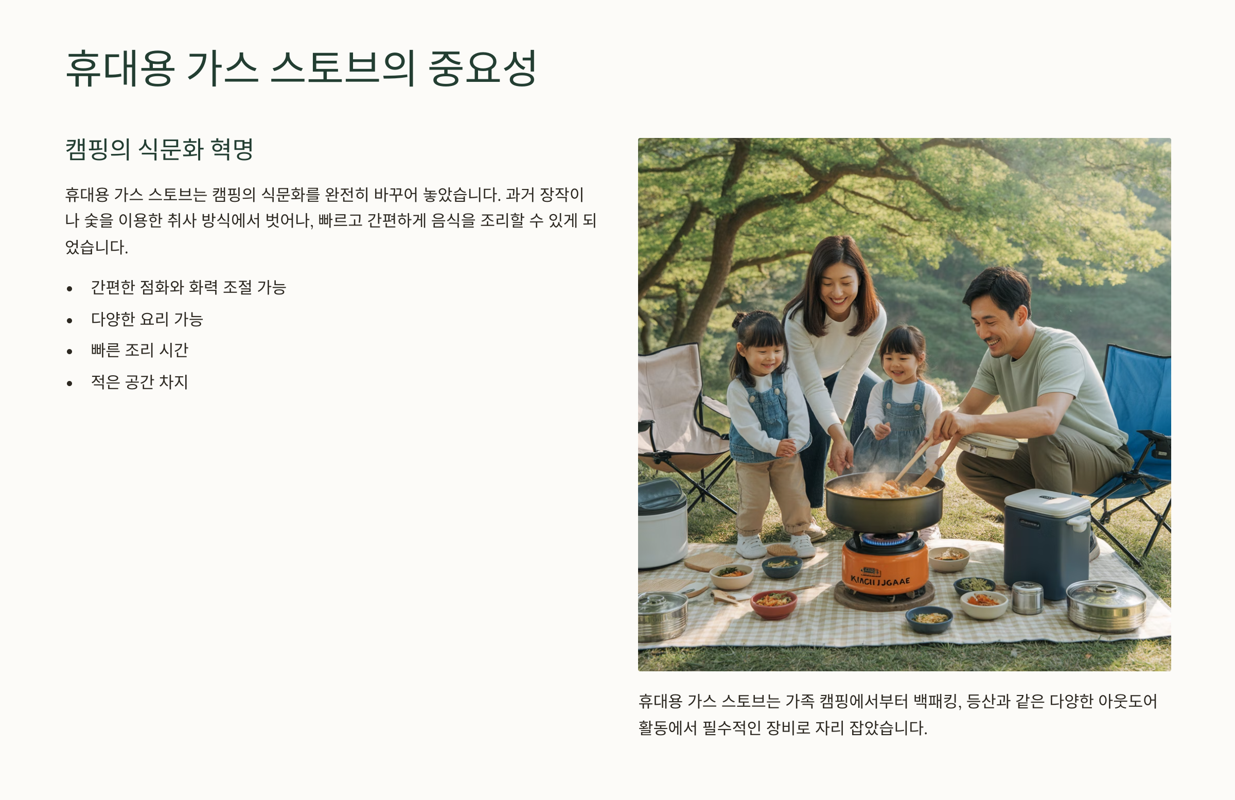 | 안전 및 편의 | 자동 점화, 안전장치, 수납 케이스, 삼발이 | 사용 편의성, 안정성, 휴대 용이성 |