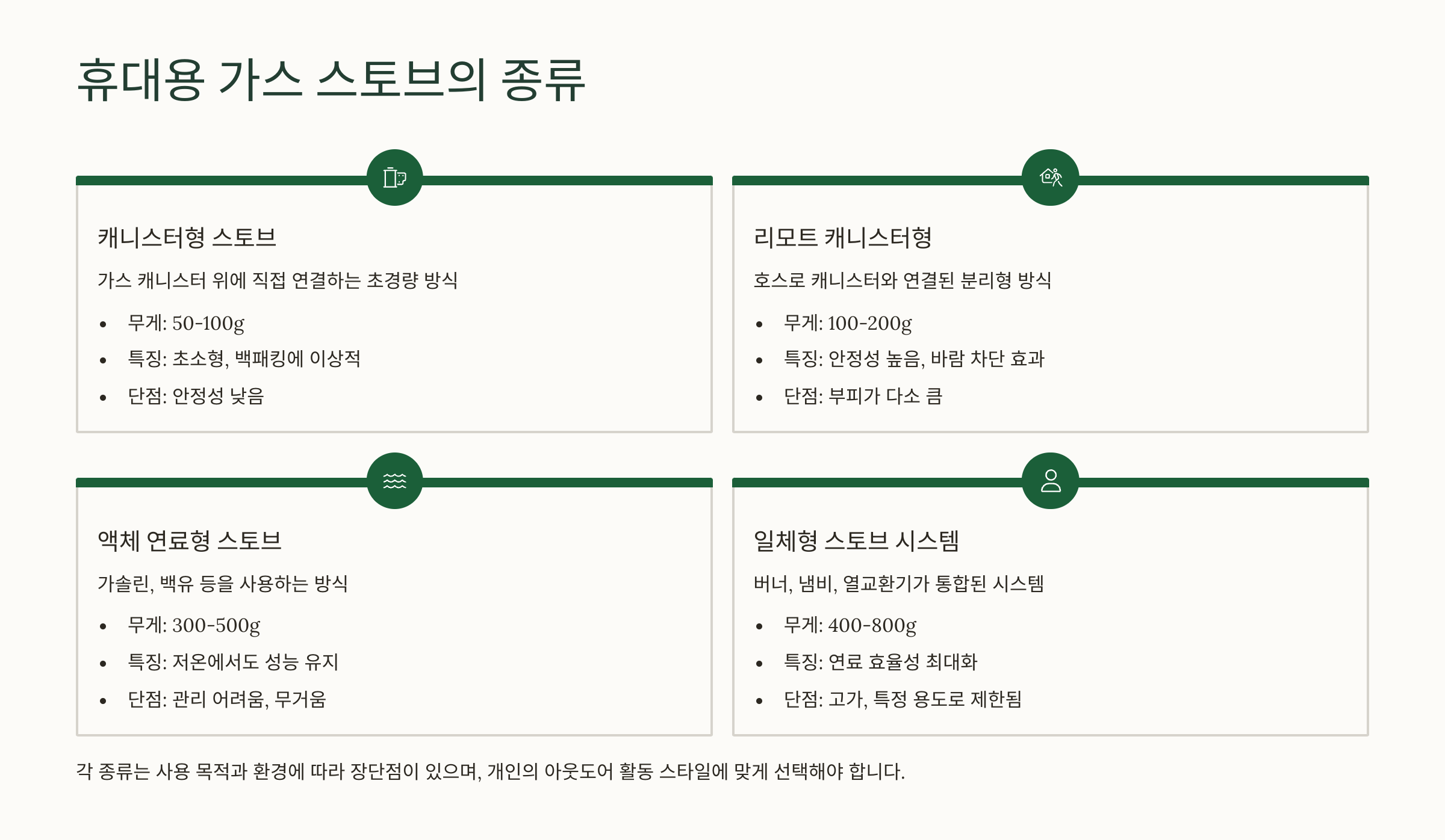 | 스토브 종류 | 특징 | 주요 장점 | 적합한 활동 |