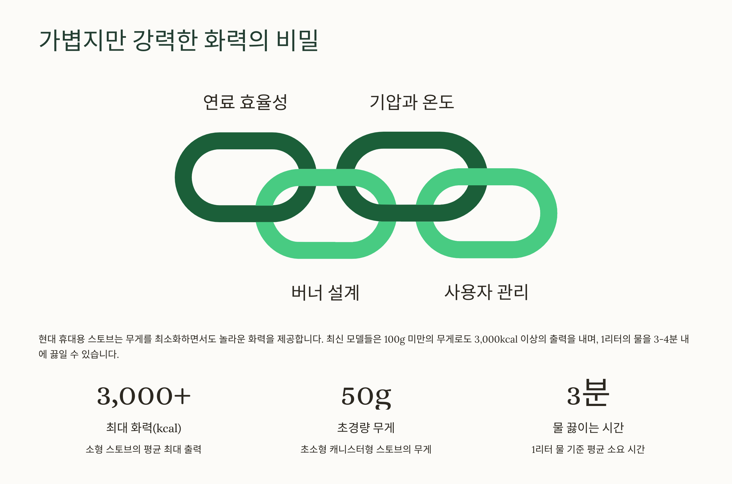 가볍다는 것은 백패킹이나 등산 시 짊어질 무게를 줄여주어 활동의 피로도를 낮춰주는 중요한 요소입니다. 반면 강력한 화력은 짧은 시간 안에 요리를 완성하고, 극한의 환경에서도 안정적인 성능을 발휘하게 해줍니다. 이 두 가지 요소를 모두 충족하는 스토브를 찾는 것은 아웃도어 경험의 질을 크게 향상시킬 수 있습니다.