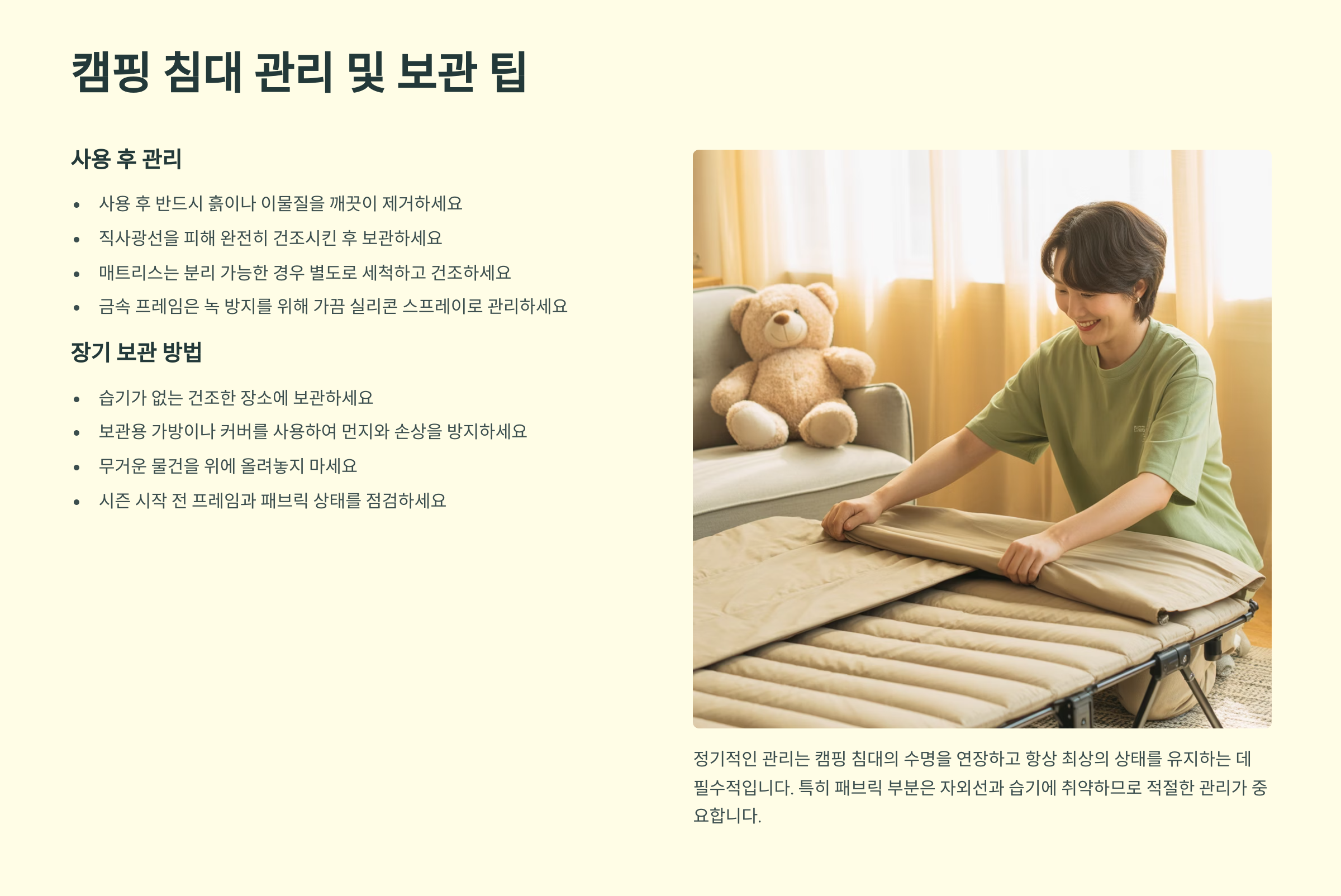 캠핑 침대 관리 및 보관 팁