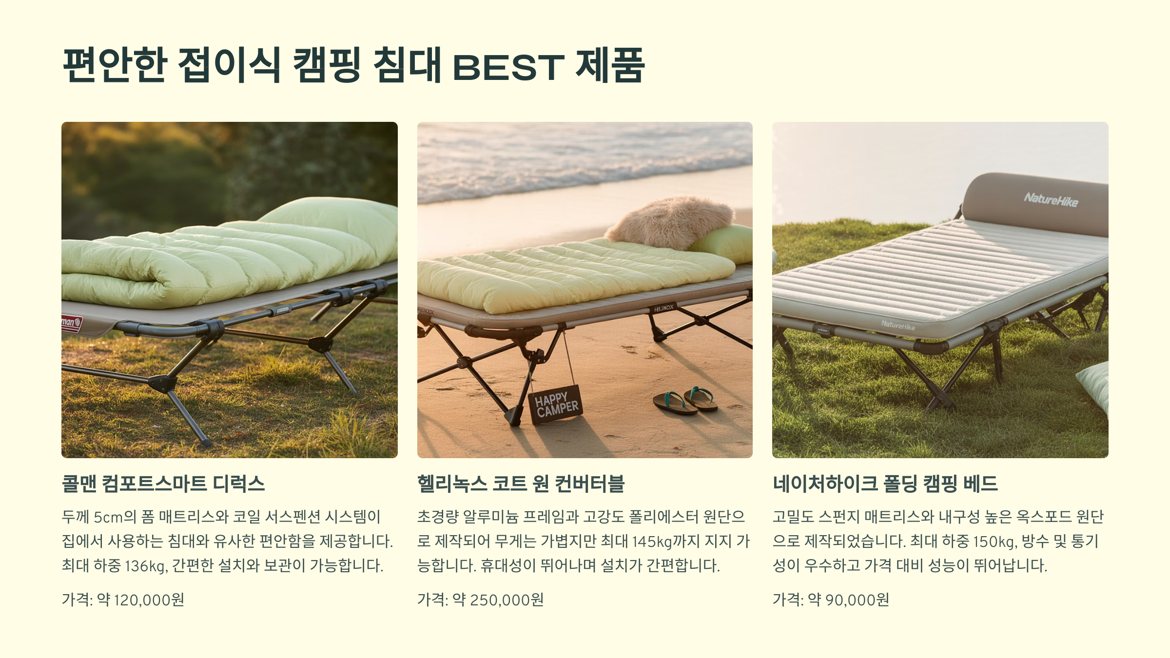 | 코베아 와이드 야전침대 | 넓은 폭, 강화 스틸 프레임 | 편안한 공간, 튼튼하고 안정적 | 오토캠핑, 가족 캠핑 |