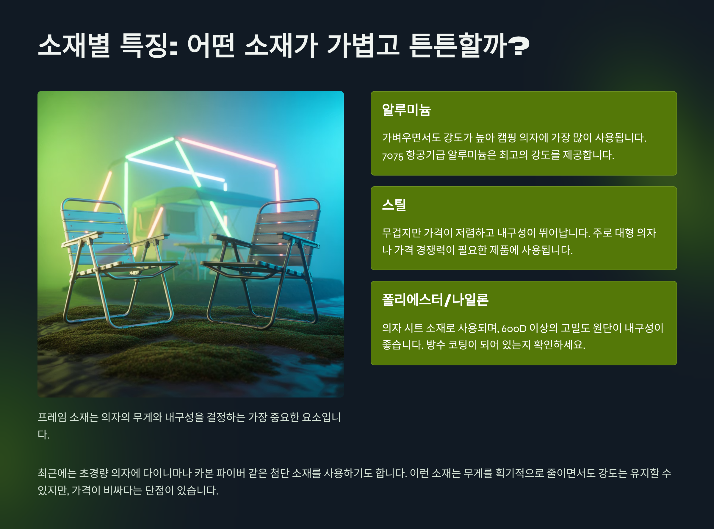 | 나일론/폴리에스터 (원단) | 가볍고 건조 빠름 | 휴대성 좋음, 다양한 디자인 | 일부 제품 내구성 약할 수 있음 | 경량 백패킹 의자, 활동적인 캠핑 |