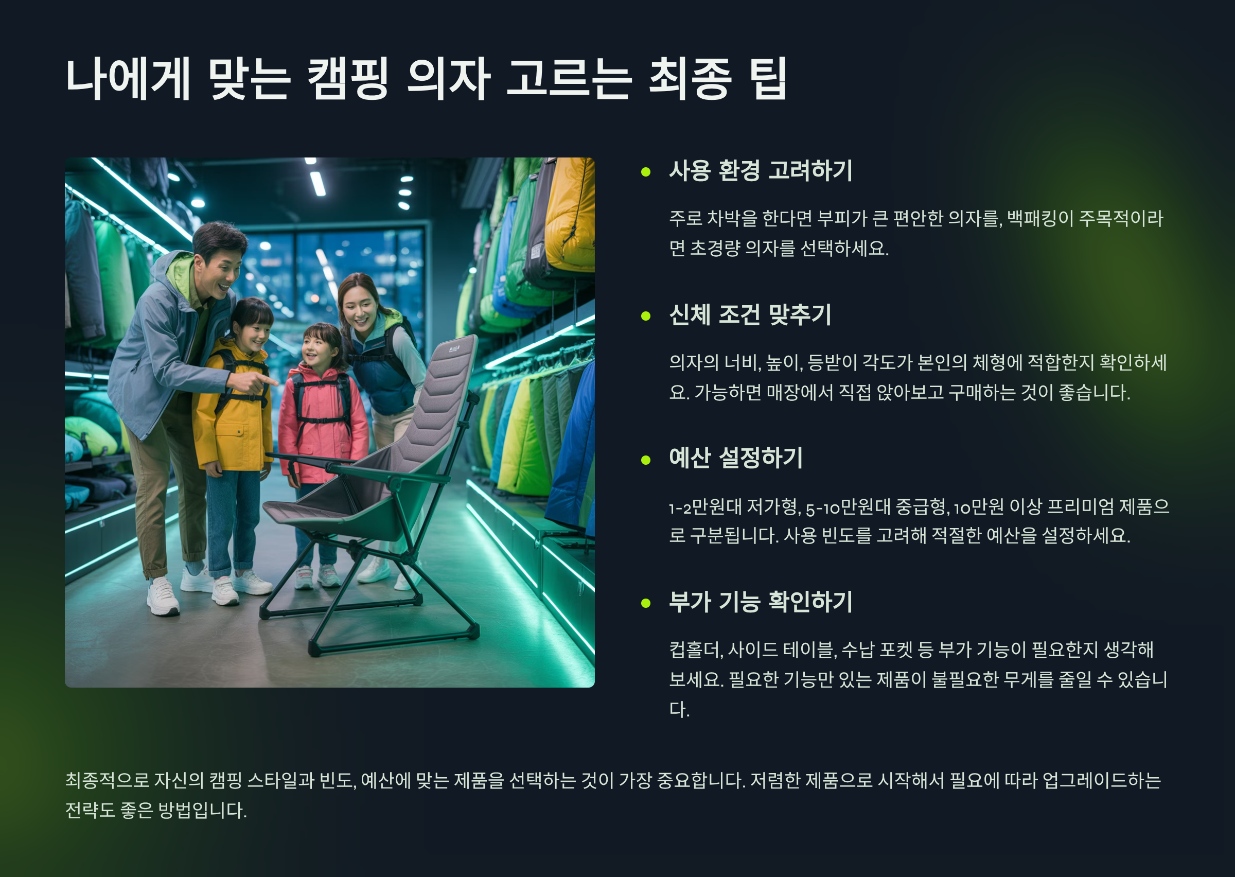 지금까지 가볍고 튼튼한 캠핑 의자를 선택하기 위한 다양한 요소들을 살펴보았습니다. 마지막으로 여러분의 캠핑 스타일에 맞춰 최적의 의자를 고르는 최종 팁을 정리해 드립니다. 가장 먼저 **자신의 캠핑 스타일을 명확히 정의**해야 합니다. 백패킹, 미니멀 캠핑, 오토캠핑, 또는 데이 캠핑 등 어떤 형태의 캠핑을 주로 하는지에 따라 의자의 무게와 부피 기준이 크게 달라집니다.