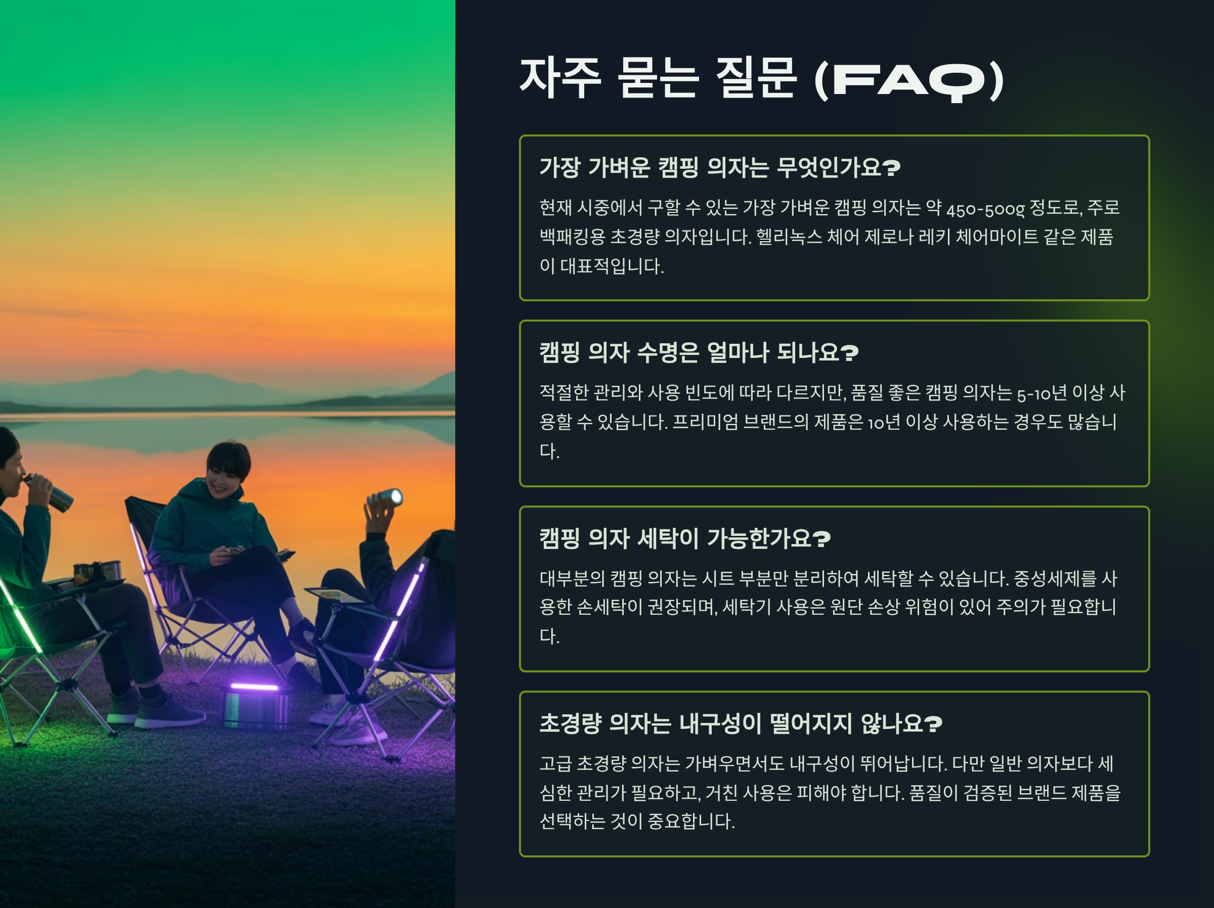 | 경량 체어 | 초경량, 분리형 조립식 | 압도적인 휴대성, 작은 수납 부피 | 조립 필요, 안정성 다소 부족 | 백패킹, 미니멀 캠핑, 등산 |